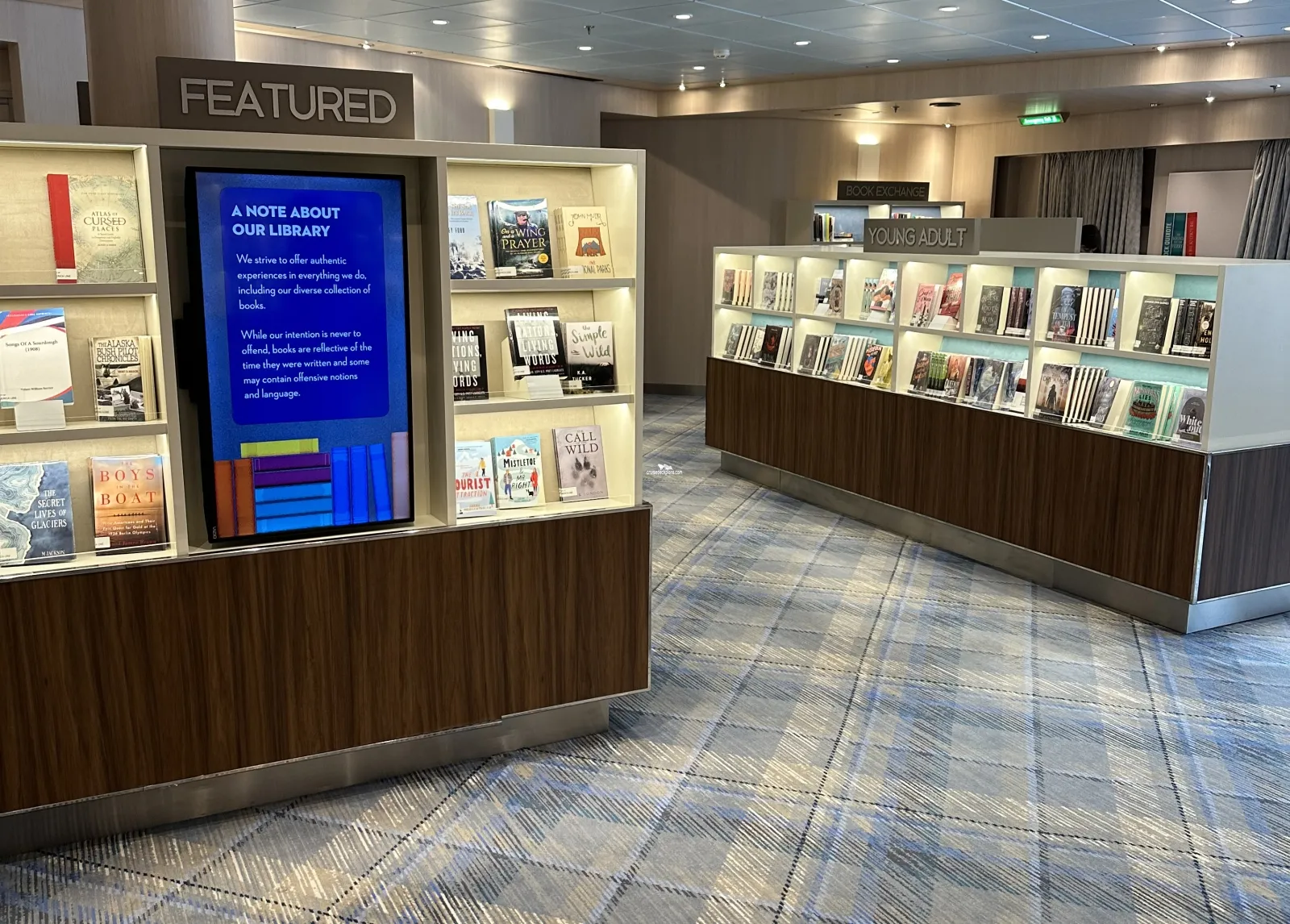 Multilevel atrium where you can find the guest services desk and future cruise desk.Library