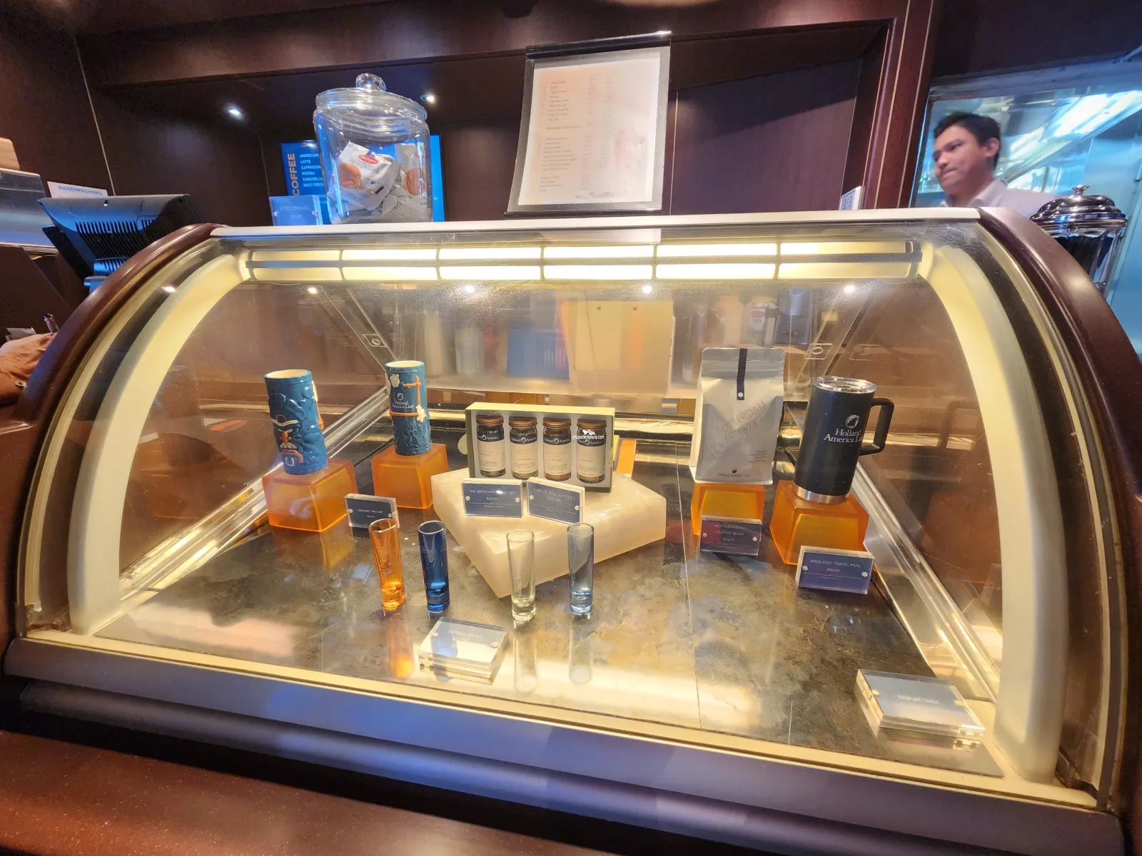 Multi-story atrium that spans the Main, Lower Promenade and Promenade decks. On first level is guest services, shore excursions and future cruise desk. There is also a bar and lounge area.Library