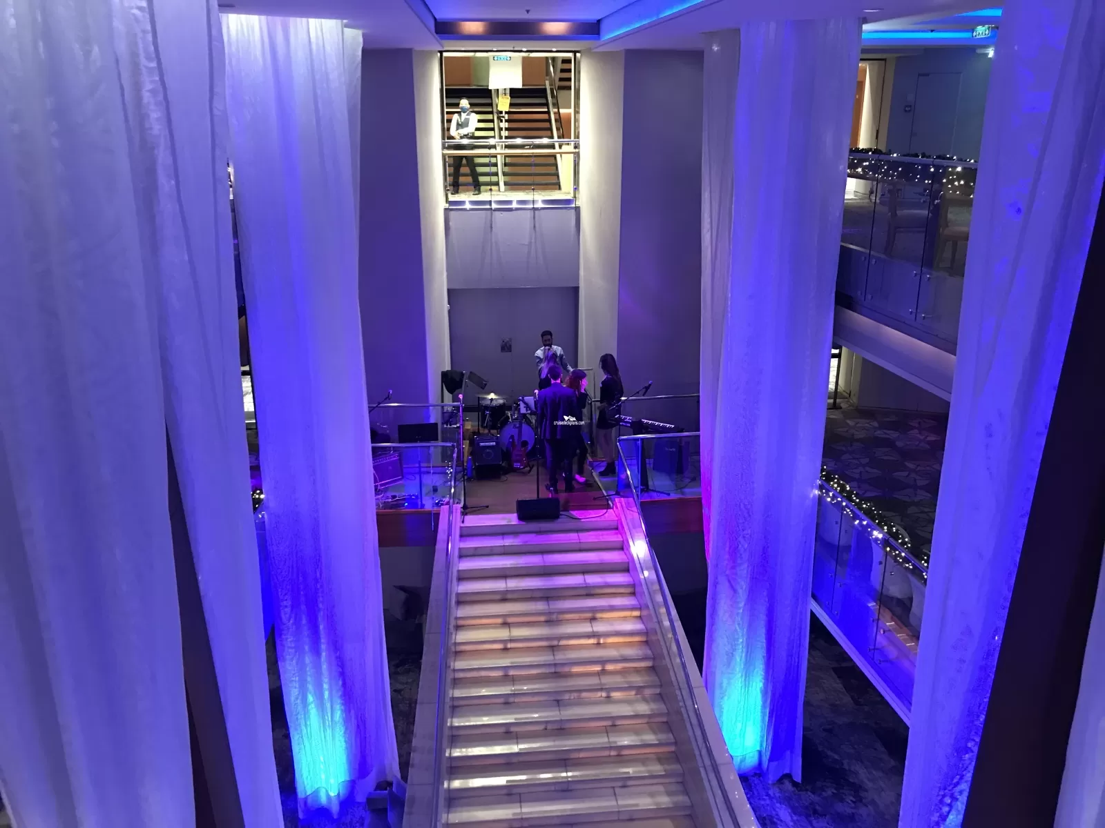 Three story high atrium. On first level is Guest Services, Shore Excursions, Concierge, and Captains Club.Promenade