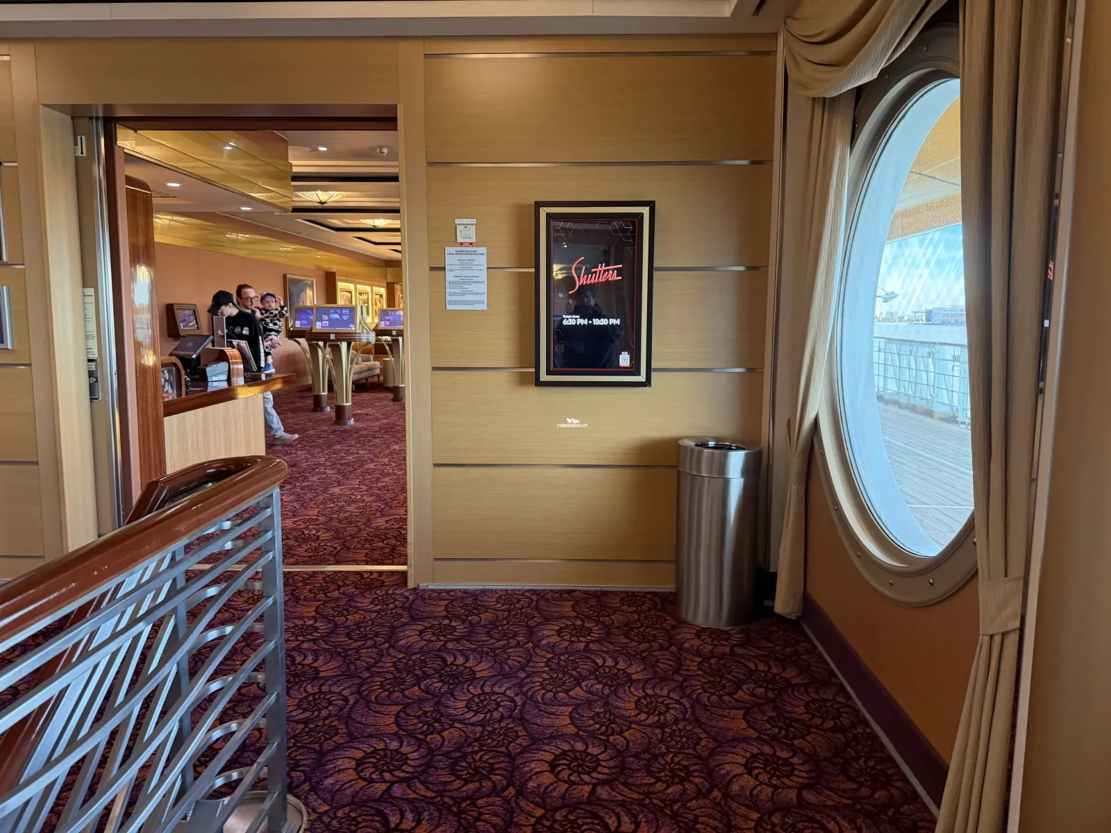Outside promenade deck with benches and chairs.Lobby Atrium