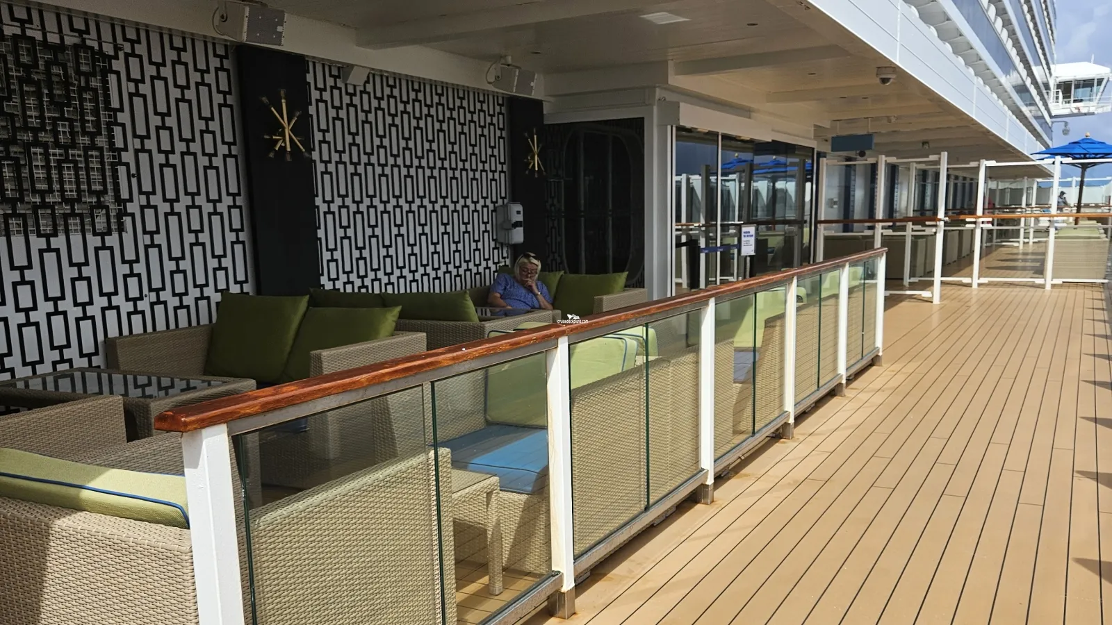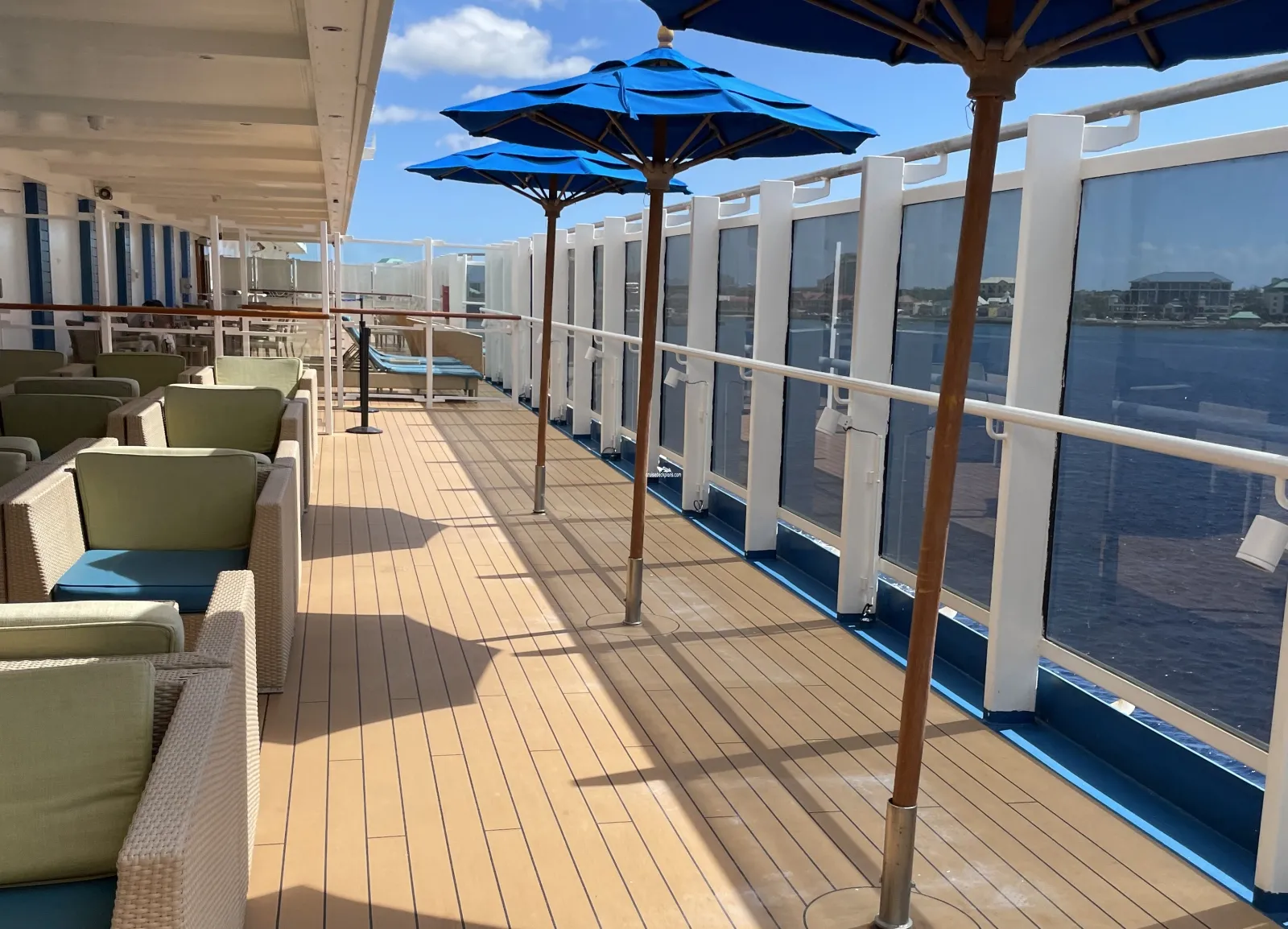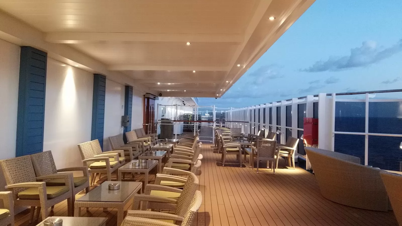 Outdoor promenaded with covered areas on port side and starboard side. There are also seating areas with tables and chairs.Guys Pig & Anchor
