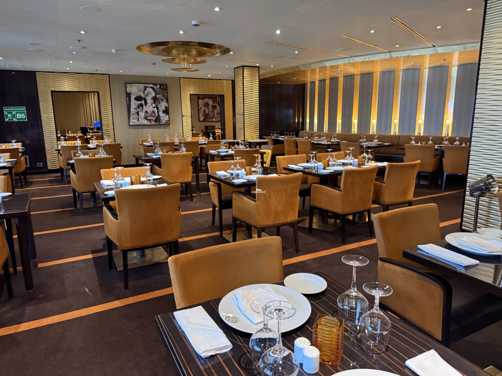 Guests can choose from a range of appetizers, soups and salads,sushi and sashimi, rolls, a bento box or a selection for two. Open for lunch on sea days from 12:00 to 2:30 p.m. Dinner is nightly from 5:00 p.m. All times are subject to change. Offers indoor and outdoor seating.Fahrenheit 555 Steakhouse