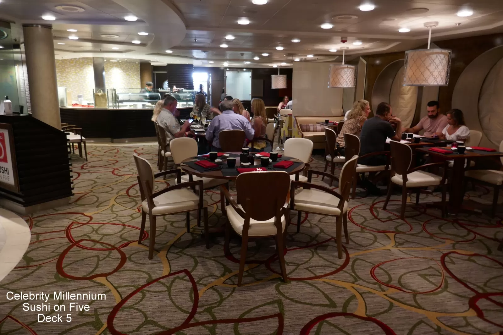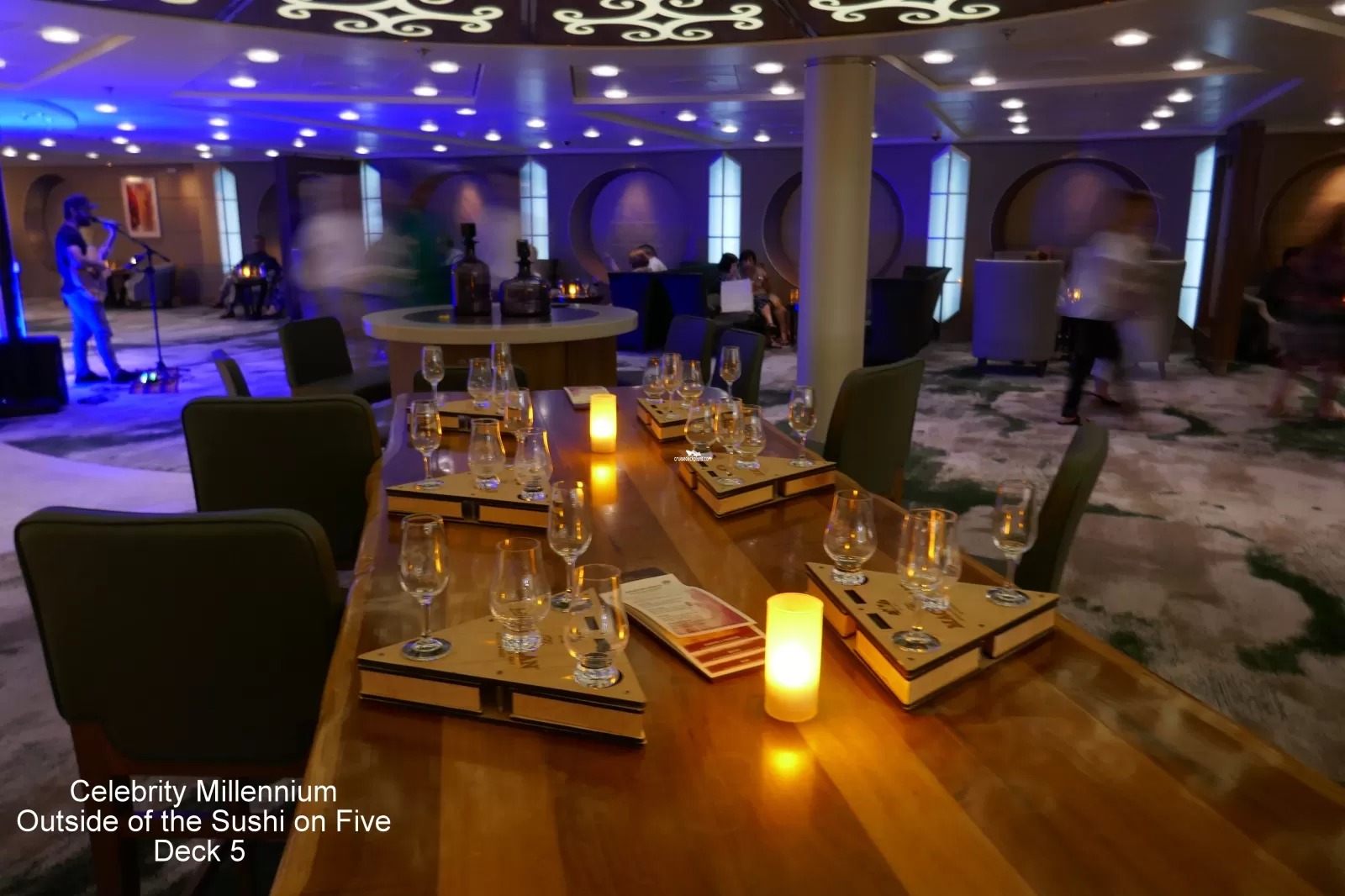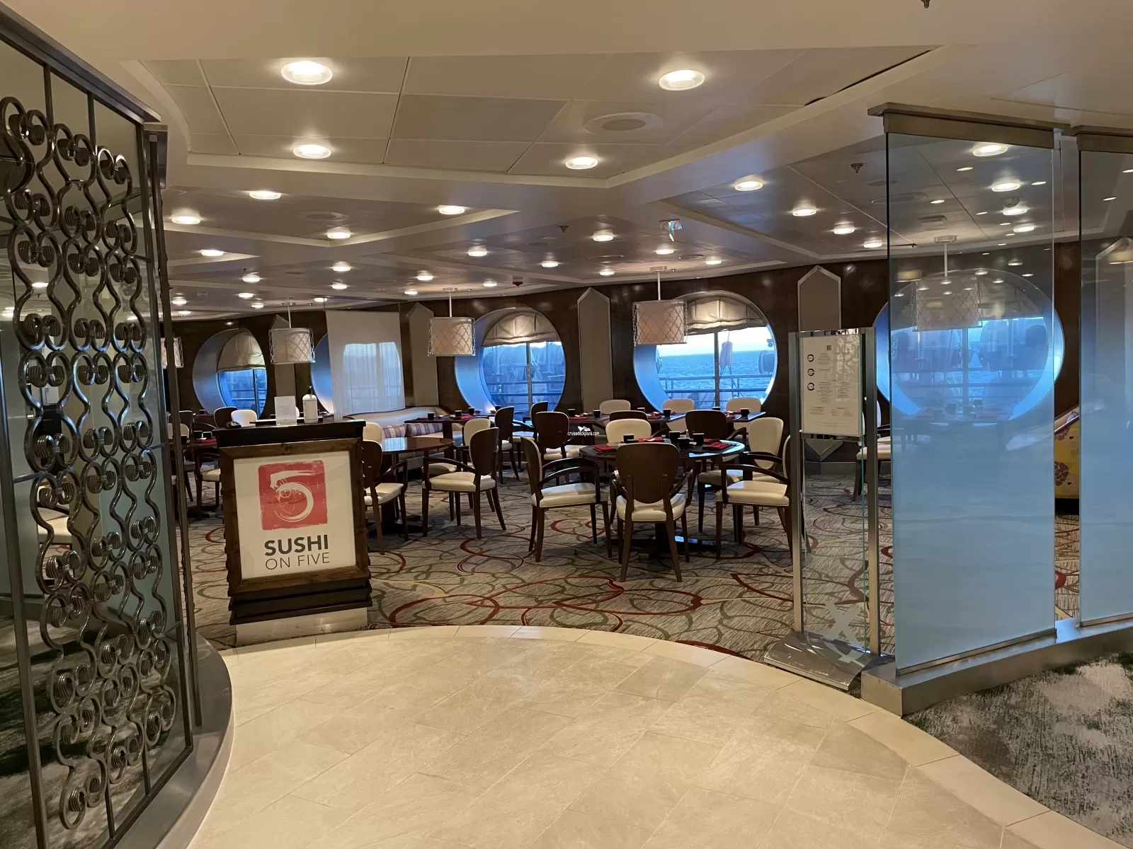 The ship's wine bar which allows guests to try a wide range of wines from a collection of both familiar and unknown wines from around the world.Sushi on Five