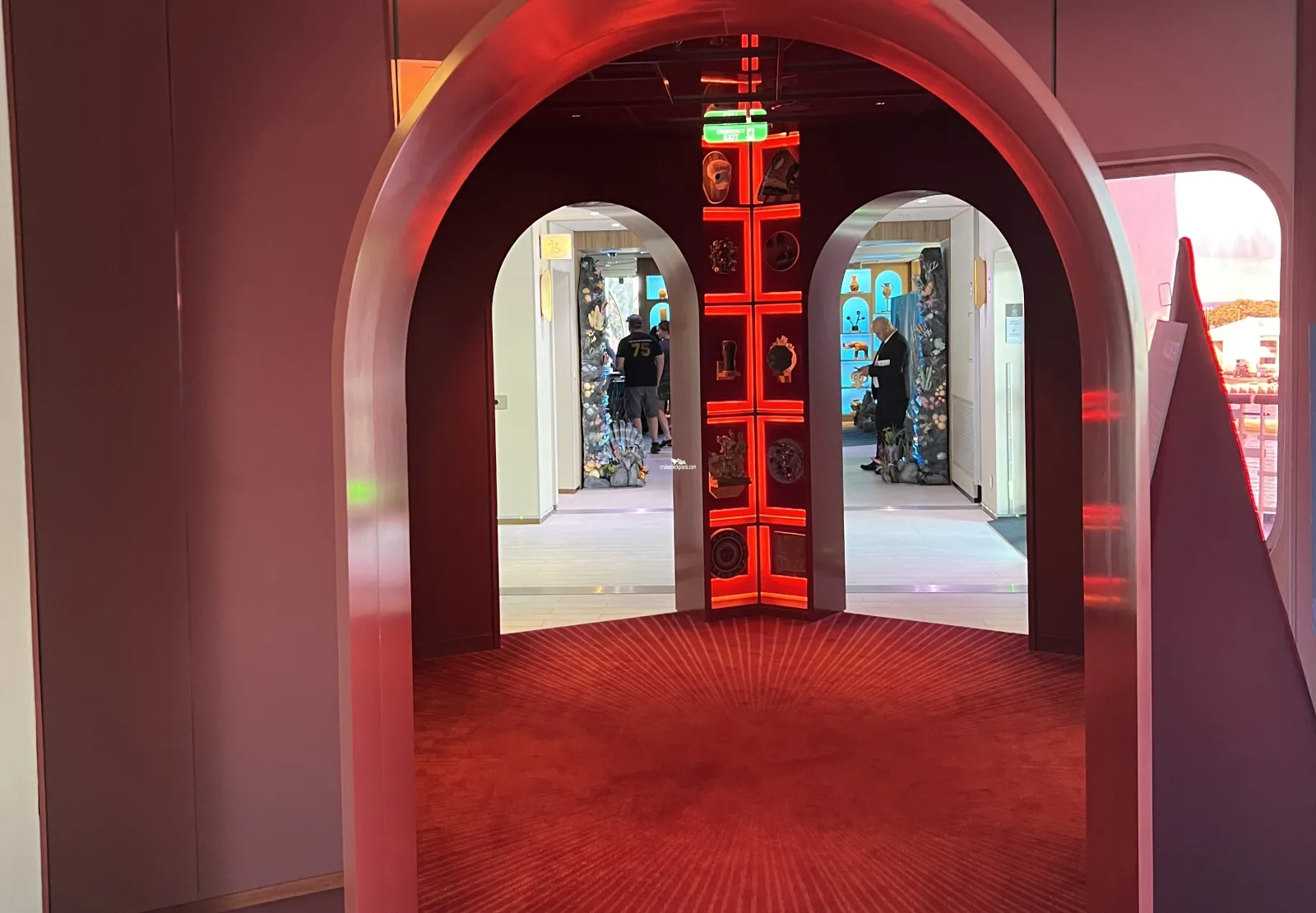 Two story lounge area with food, drinks, entertainment and large windows overlooking wake of ship. There is a panoramic walkway between the two levels.Market at the Bazaar