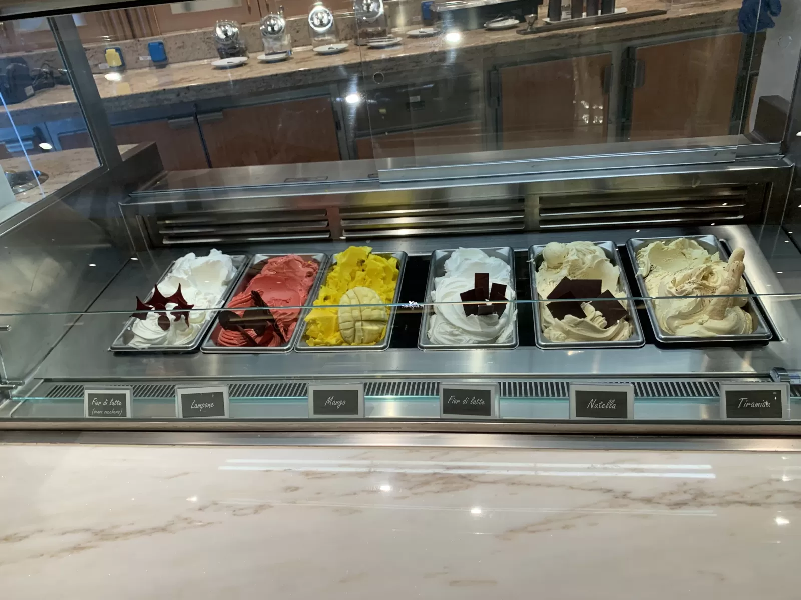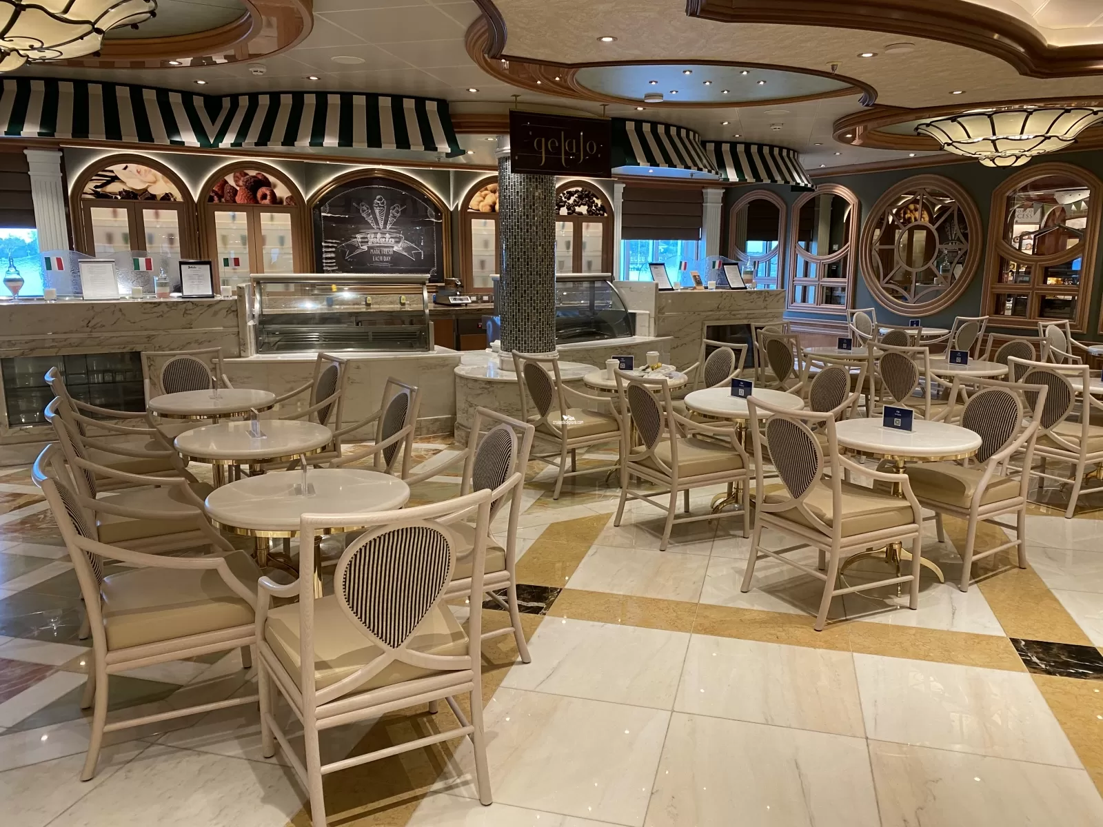 Provides guests with fresh baked pastries, warm cookies, desserts and specialty coffees all included in their fare.Gelato