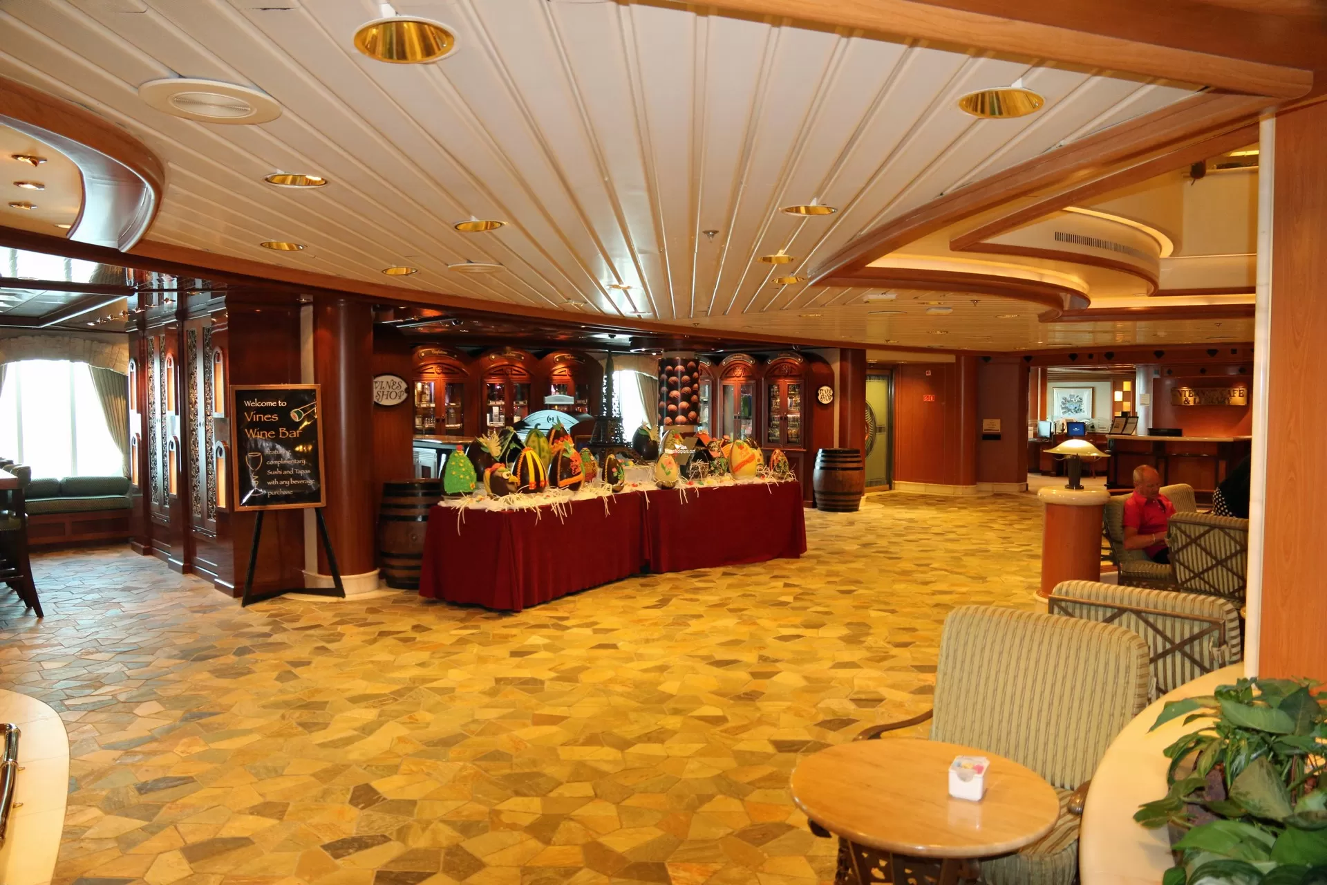 The central hub of the ship on the Plaza Deck and keeps guests, eating at the International Cafe or enjoying a drink from the bar, entertained with a variety of activities from ice and vegetable carving to acrobats and string quartets.Internet Cafe