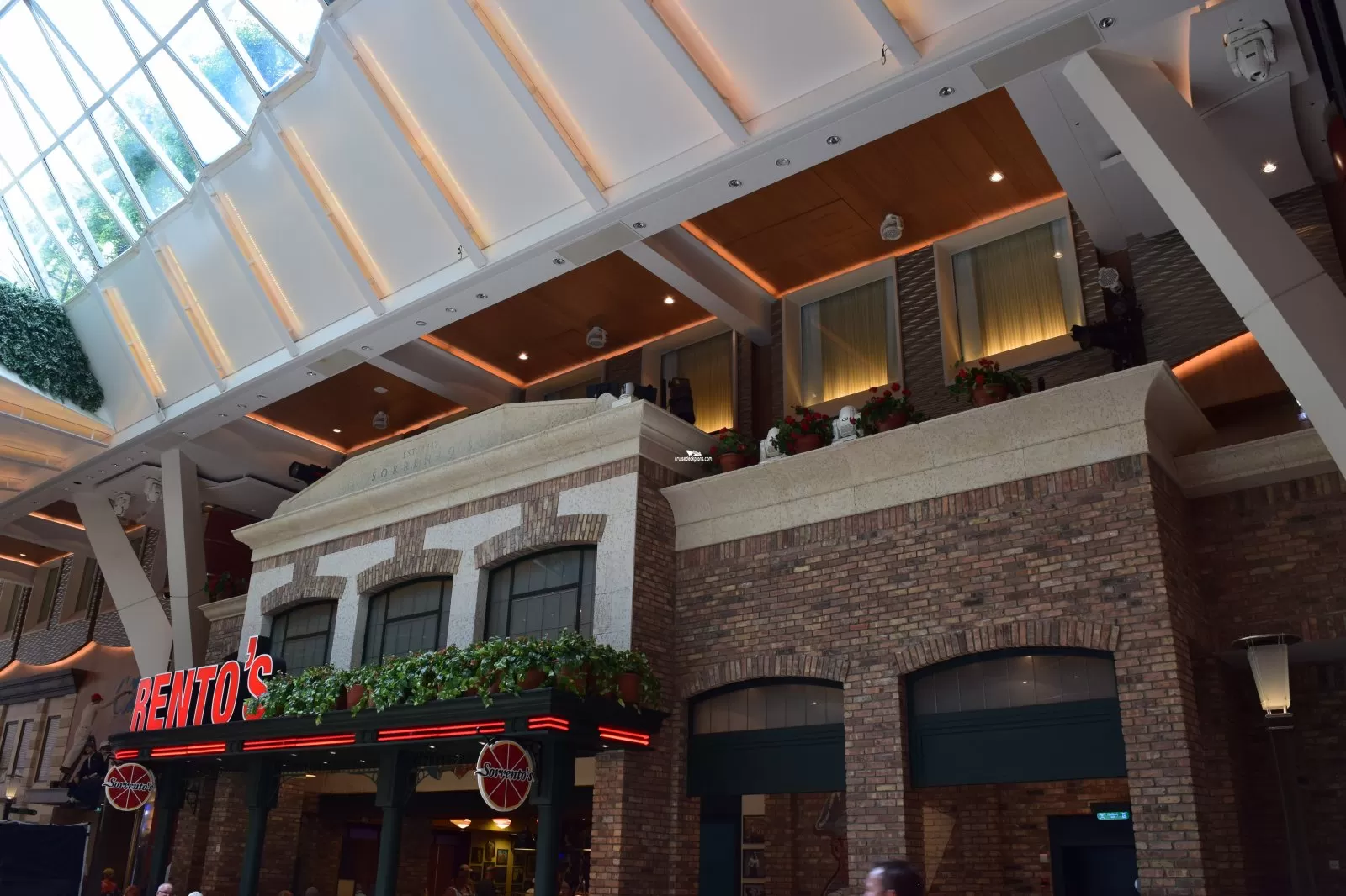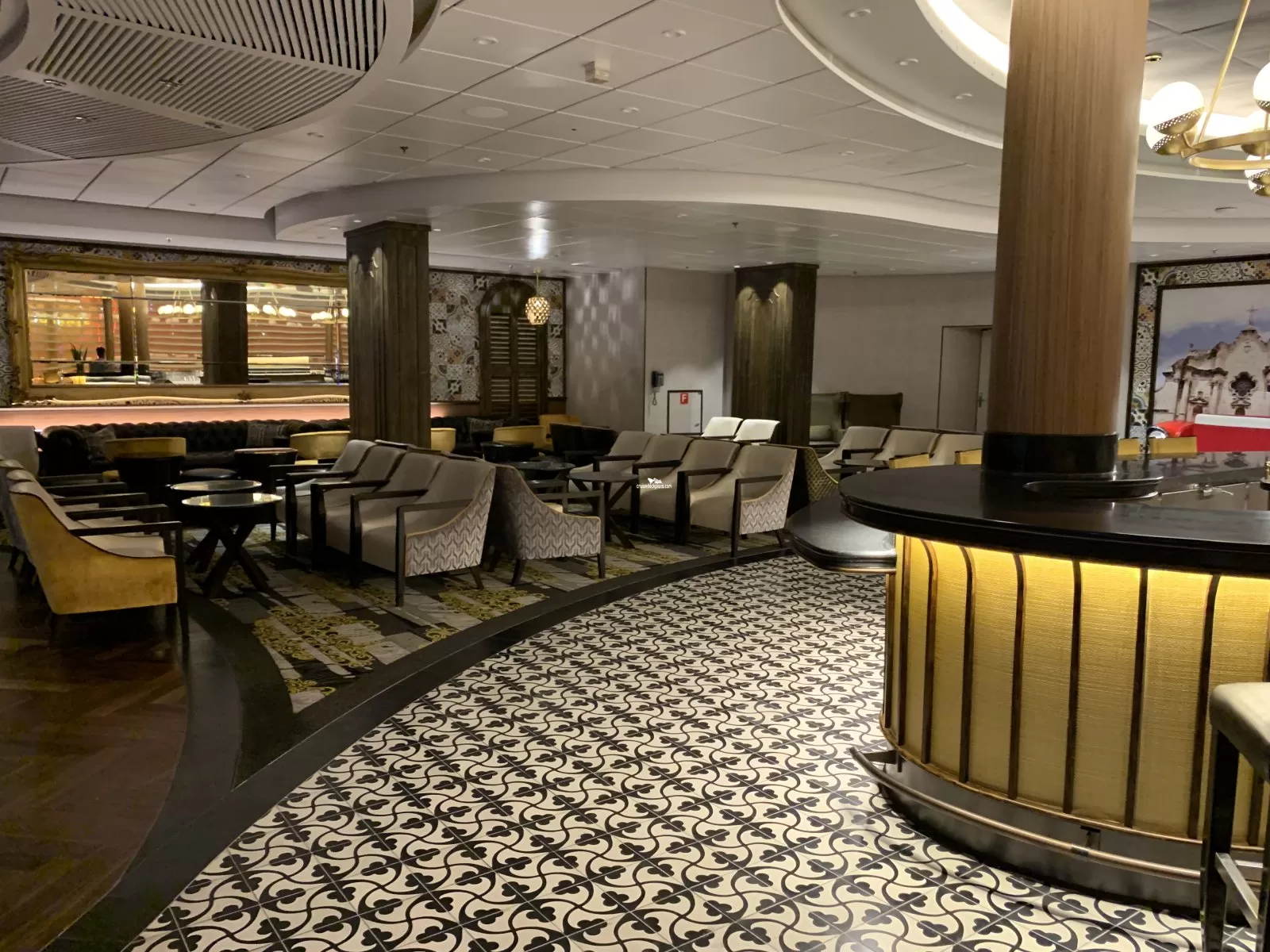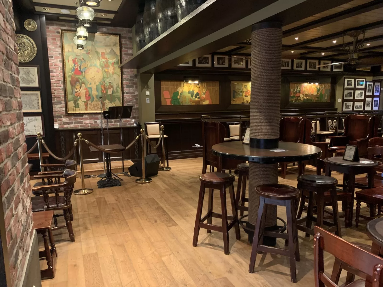 Centrally located along the Royal Promenade and is an ideal meeting place for drinks, people, performances and more with pub entertainment and sing-a-longs. The interior is decorated in the style of an old fashioned English pub with wooden chairs and tables whilst outside the giant copper globe incorporated into the pub's facade above the entrance cracks open to reveal the Atlas Bridge which unfurls on hinged hydraulics and extends out over the Promenade as a bridge platform, 10 feet above the ground. Entertainment acts then perform on the platform during Royal Promenade parades.Theater