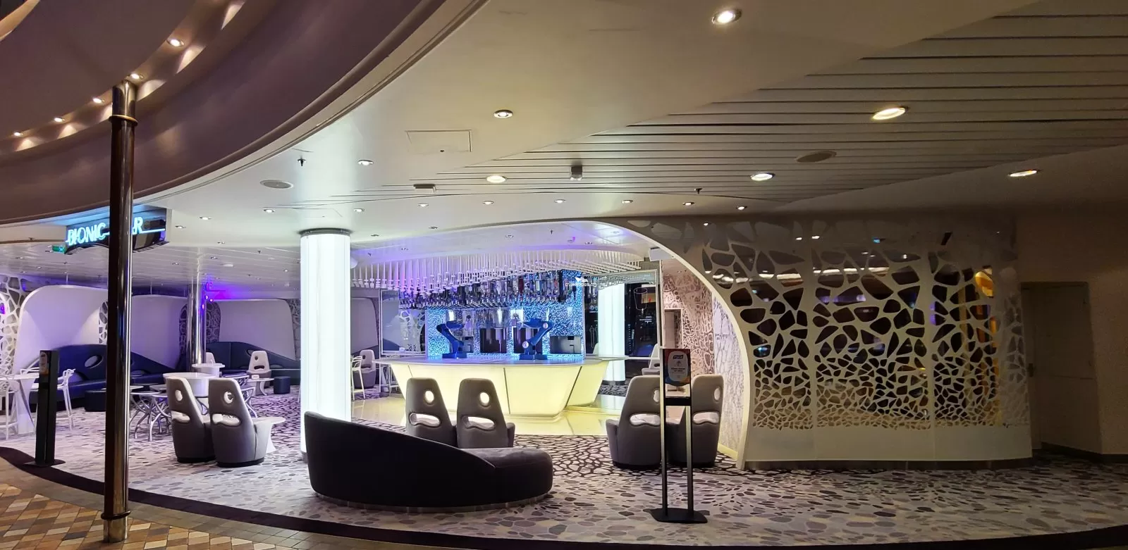 Allowing passengers to enjoy a cocktail whilst they move slowly between the Royal Promenade on deck 5 to Central Park on deck 8. The oval-shaped, glass-enclosed bar seats 32 passengers and travels up the three decks to Central Park every half hour. It is also used to host single and solo travellers get-togethers throughout the cruise.Sorrentos