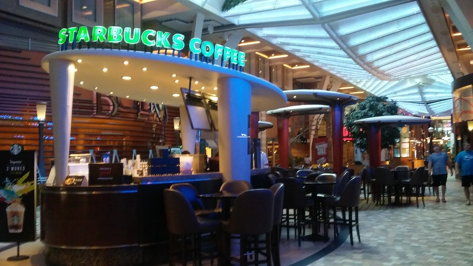 The 1,380 seat 3 deck high Opal Theatre is located on Entertainment Place completely forward. It includes a spiral staircase at each side of the stage and a moveable bridge across the top. Incorporated into the stage are aerial wires that are integrated into some of the Come Fly With Me show. The state of the art theatre features the ships Broadway-style theatre productions and aerial acts with two performances per night.Starbucks