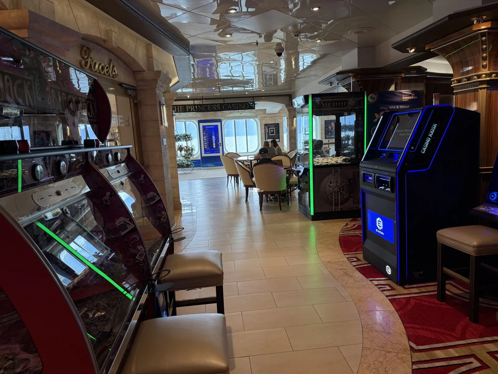 Ships atrium. On first level is passenger services, shore excursions, future cruise sales, circle desk (loyalty desk), and a lounge area.Ocean Front
