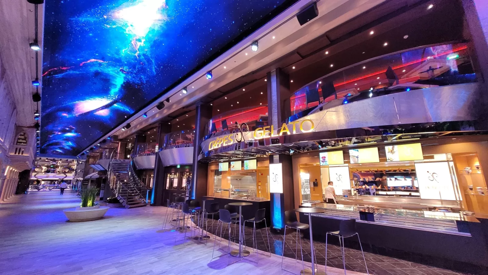 Features Rob the 1st humanoid robotic bartender, create your own recipe with over 40 ingredients to choose from. Serves 16 signature cosmic cocktails (both alcoholic and non-alcoholic) using Infinity Touch table device. You can also purchase themed futuristic glasses. Seats 60 guests in 1,722 square foot area.Atrium - Deck 6