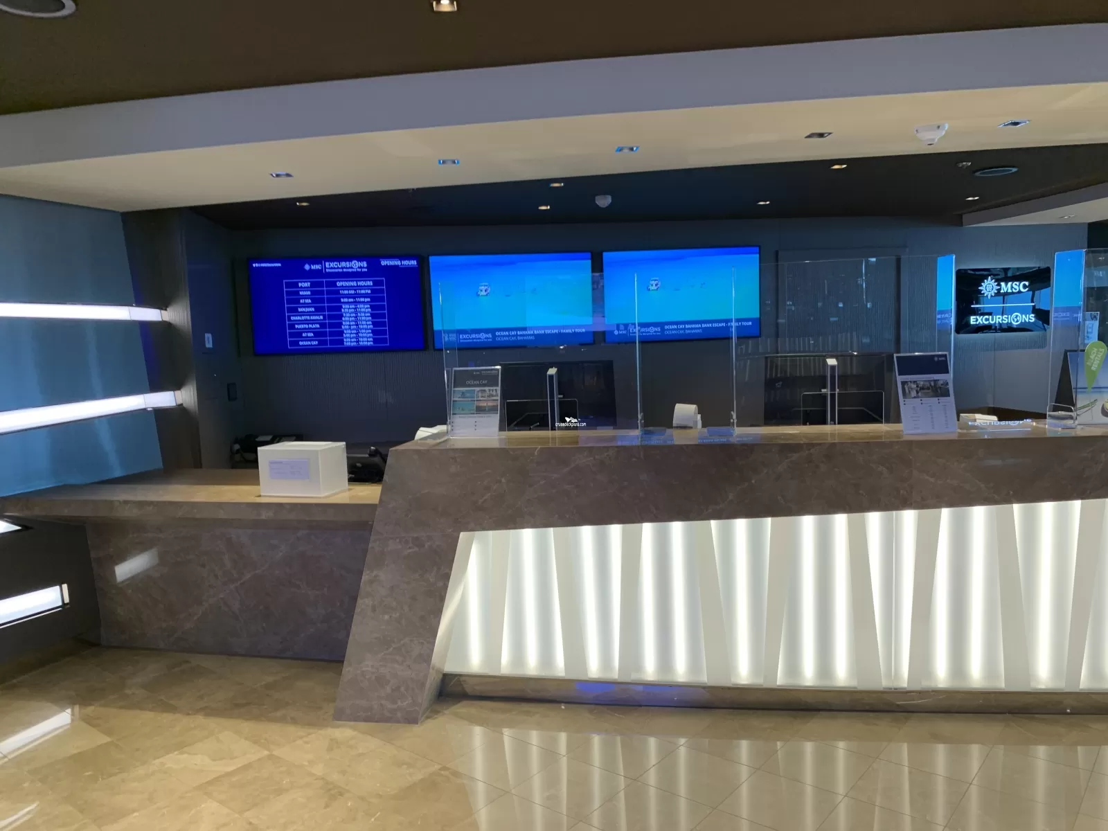 Desk for planning and booking MSC sponsored shore excursions.Le Cabaret Rouge