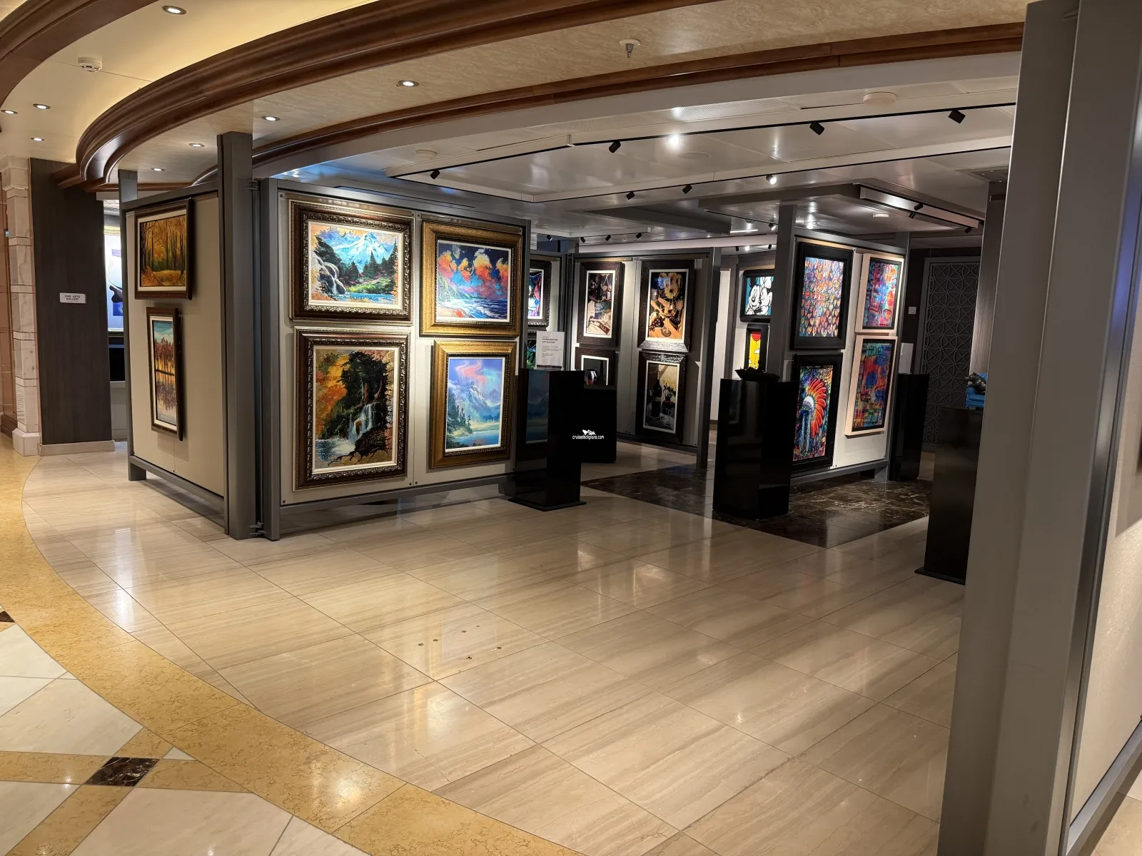 The ship's Art Gallery displaying a range of artwork for guests to view and purchase during the ship's champagne art auctionsThe Piazza
