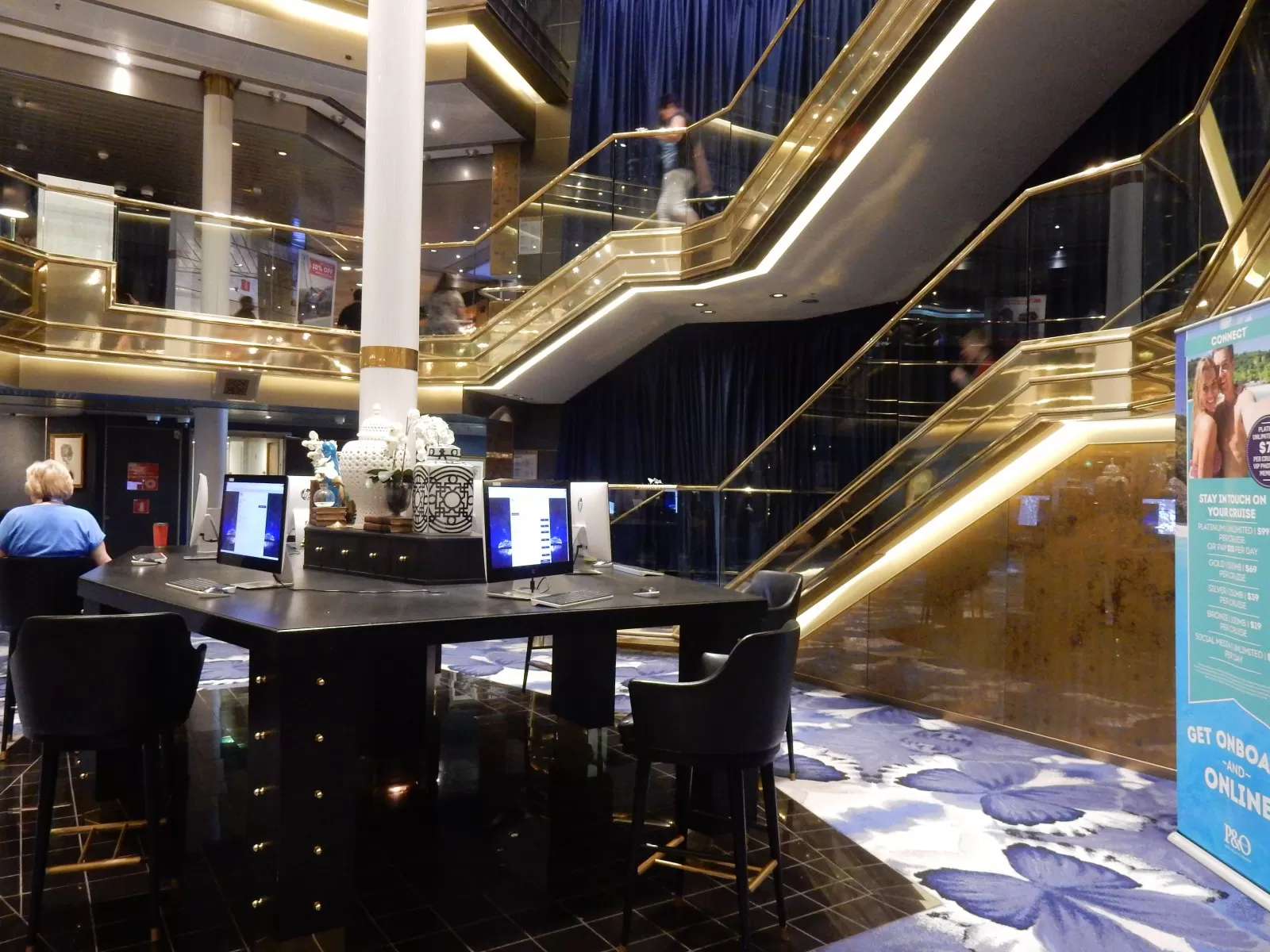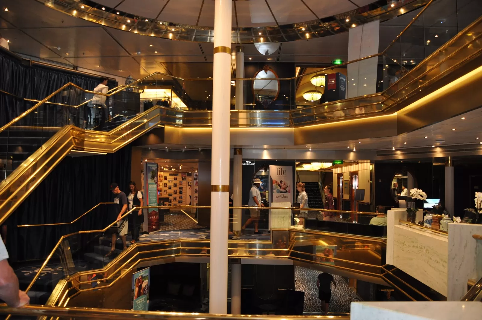 Three story high open floor plan area with live music. The lower level has glass doors leading to outside promenade deck. The second level has reception desk, shore tour desk.Exterior Promenade