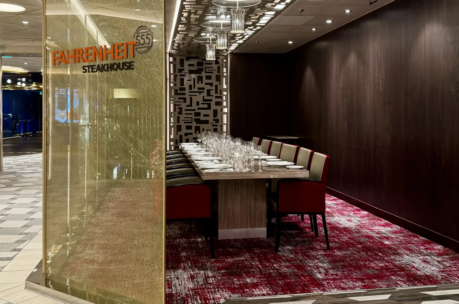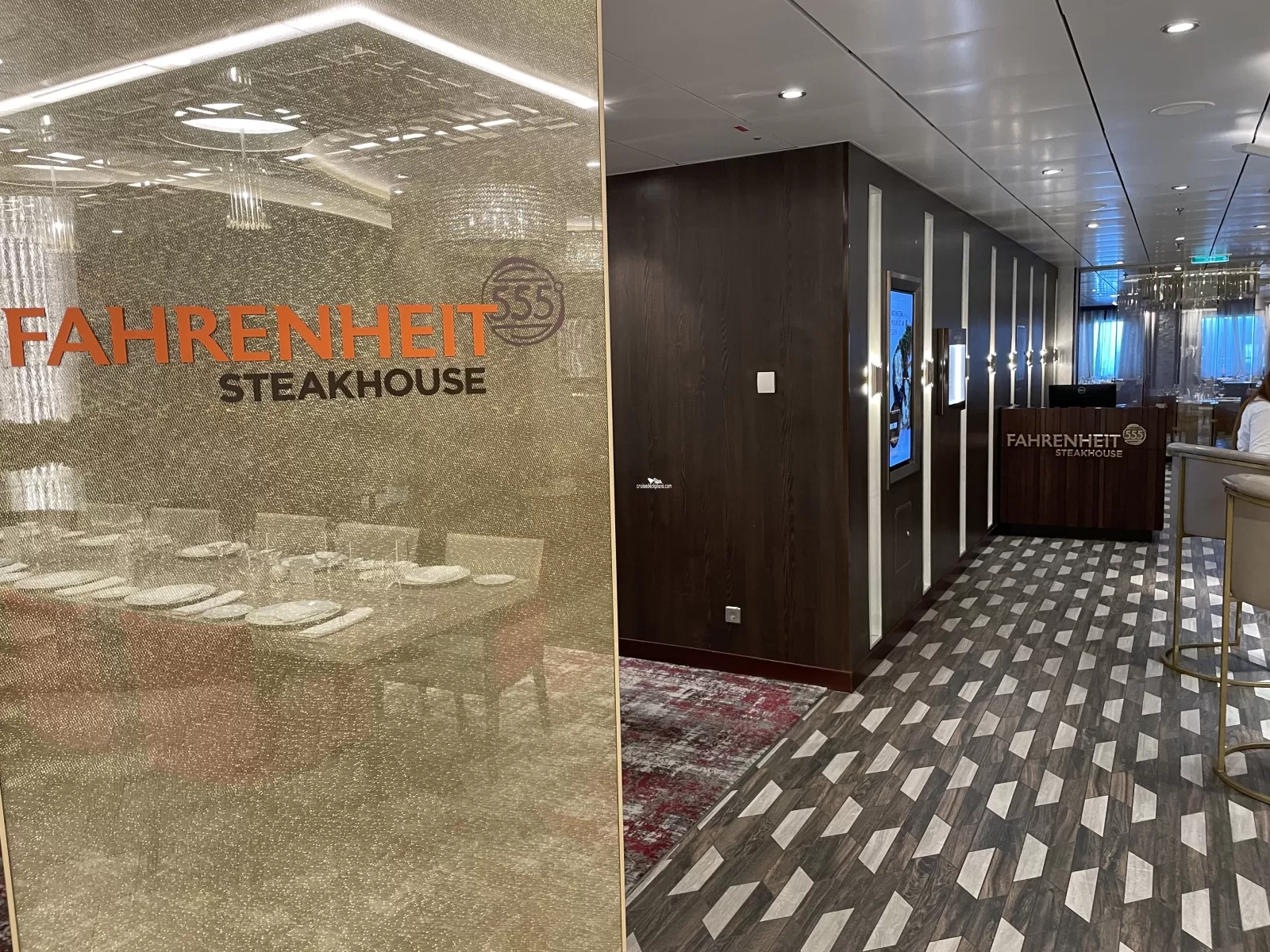 Two level main restaurant on aft of decks 6 and deck 7. Sit-down waiter service open nightly for dinner.Fahrenheit 555 Steakhouse