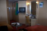 * Forward facing oceanview cabins on this deck are preferred because they are large irregular shapped cabins with a large porthole style window that looks over the front of the ship.