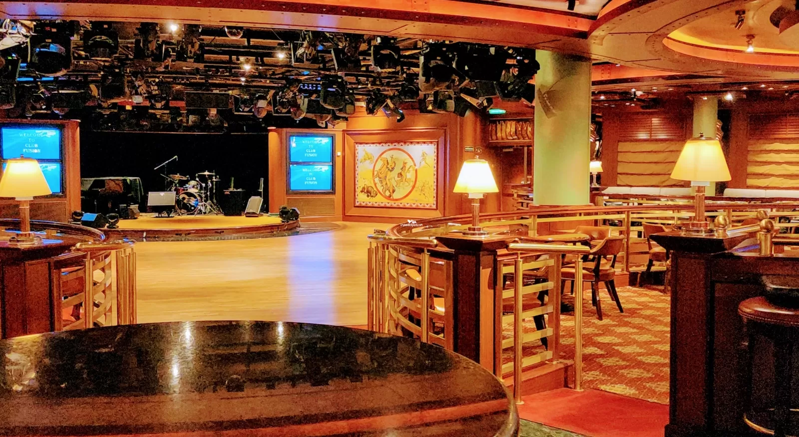 Ships main atrium. On first level is seating area, piano, dance floor, cafe and barEffy