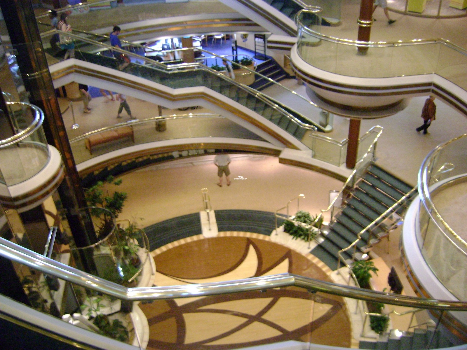 Multi-story ships atrium. On deck 4 is guest relations desk and shore excursion desk.Boleros Lounge