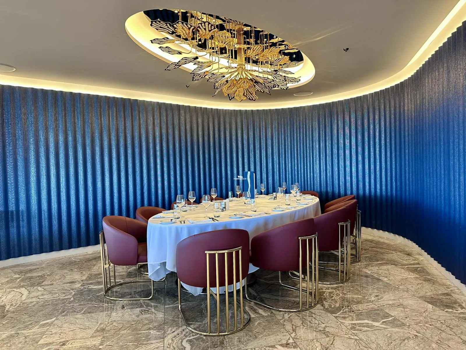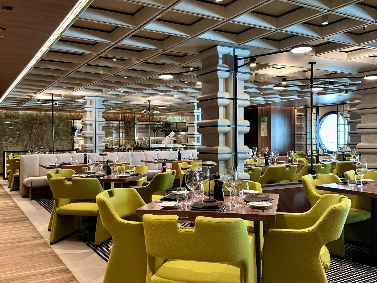 Complimentary main dining room. Features 270-degree views through floor to ceiling windows. Prepare to be wowed by the updated classic of Beef Wellington - a tender beef striploin with mushroom duxelles and wrapped in Flaky Pastry. Tap into your surroundings with the seafood paella filled with bomba rice, shrimp, sea bass, mussels, and clams and follow-it up with an American favorite - apple pie drizzled with butterscotch sauce and topped with Vanilla Ice Cream.Metropolitan Bar