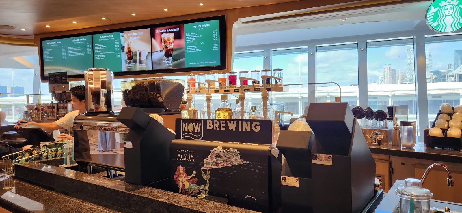 Sing along to your favorite hits as your sip on specialty cocktails. The interactive experience and rollicking house band will take you back to rocks glory days. Note: This venue is very small for this size ship and Haven guests are allowed seats first. Therefore even if you try to book as soon as you board you will likely not get seating.Starbucks