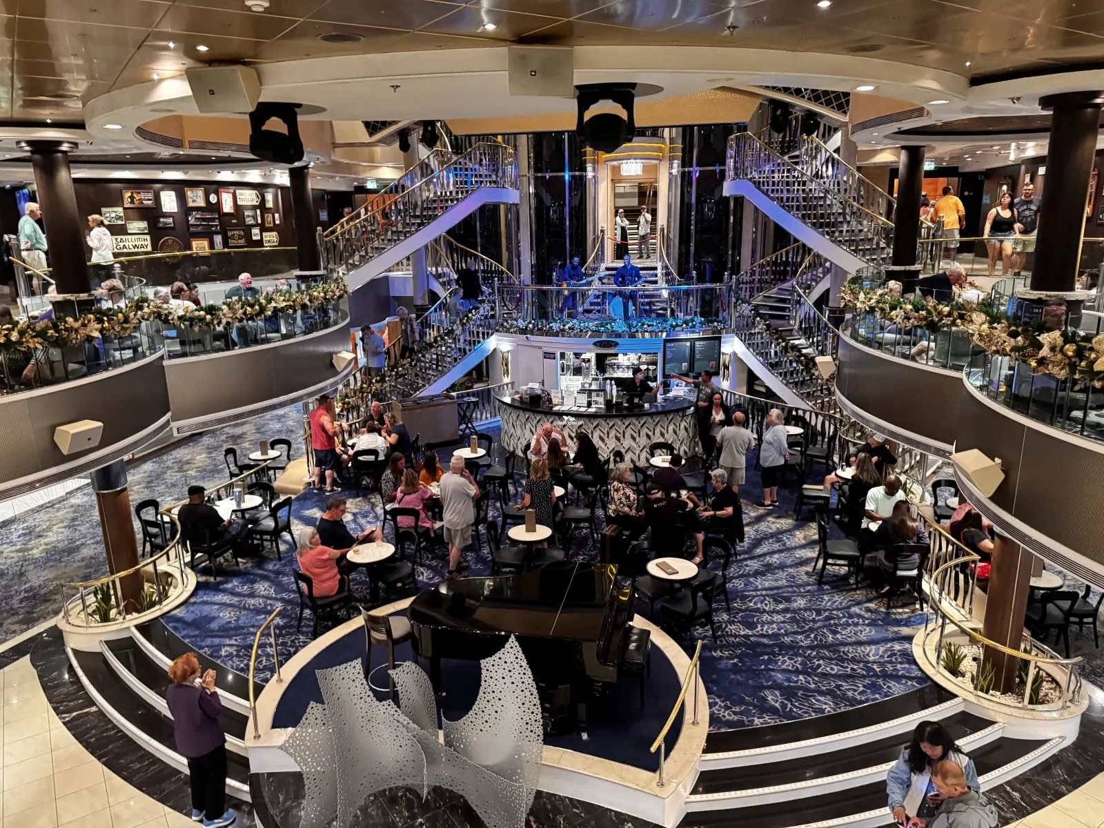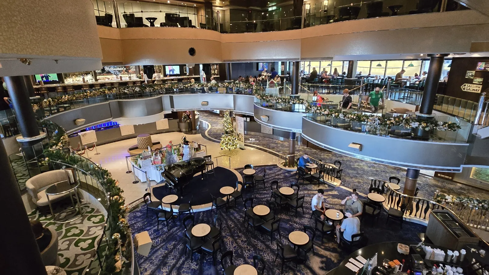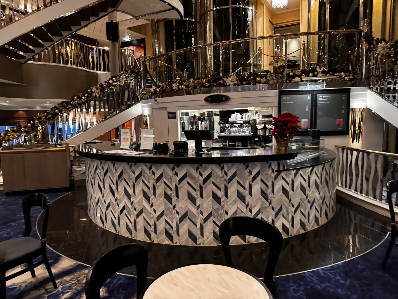 Main atrium with guest services desk, shore excursion desk, coffee bar and lounge chairs. Open to two decks above.Promenade