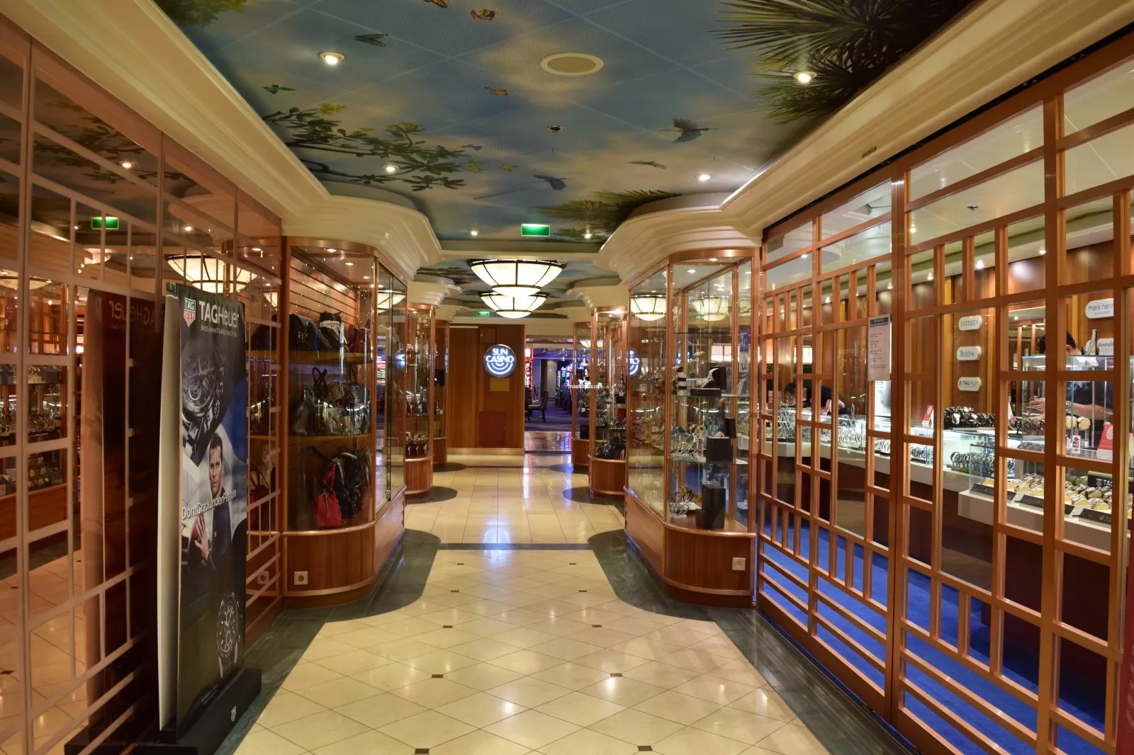 The ship's tax and duty free shops selling a range of items from jewelery, designer watches, cosmetics and perfume to clothes, sweets, sundries, souvenirs, liquor and tobacco. Brands on offer range from CK, Clinque and Armani to Lacoste and Lancome.Sun Club Casino