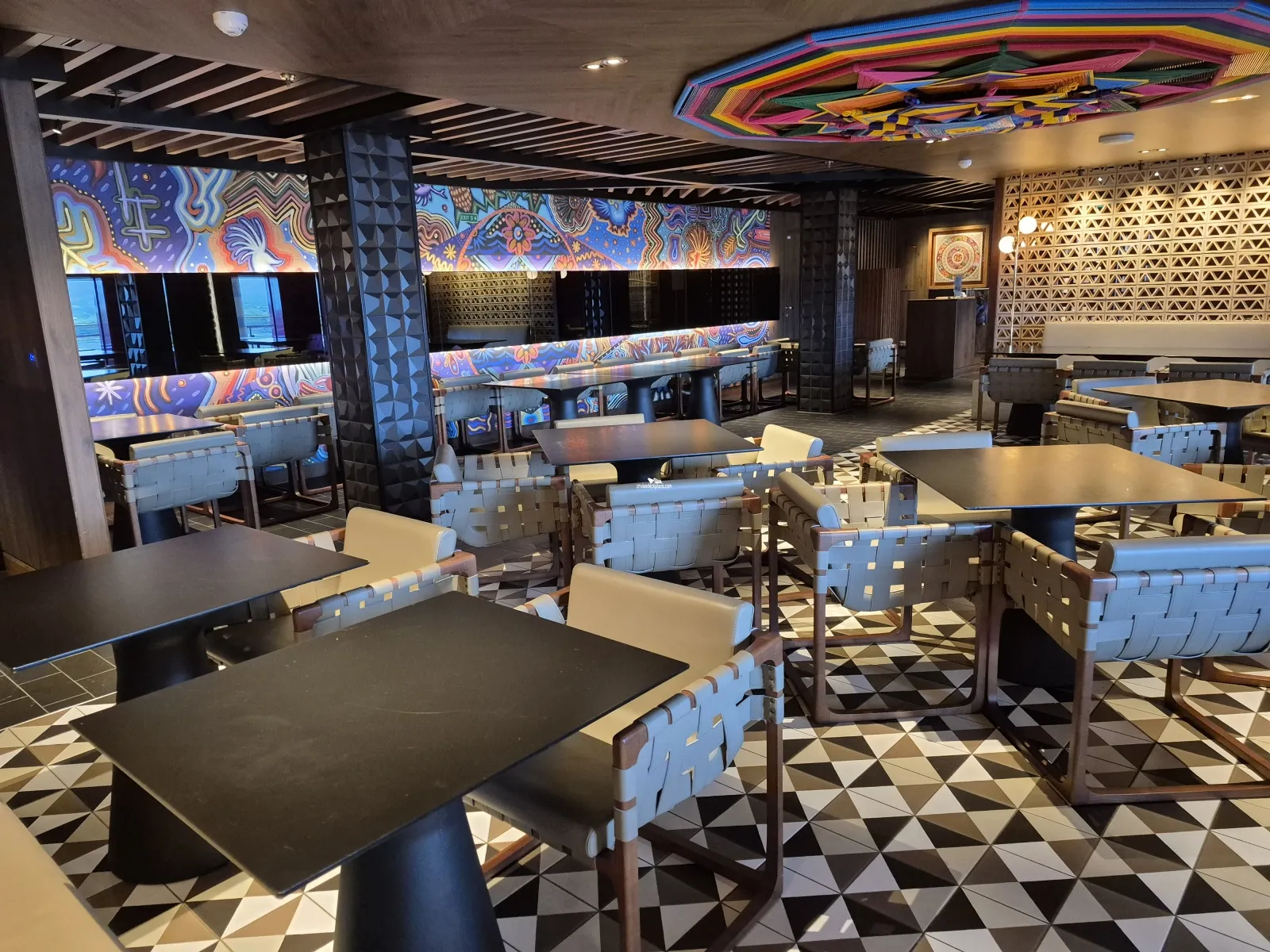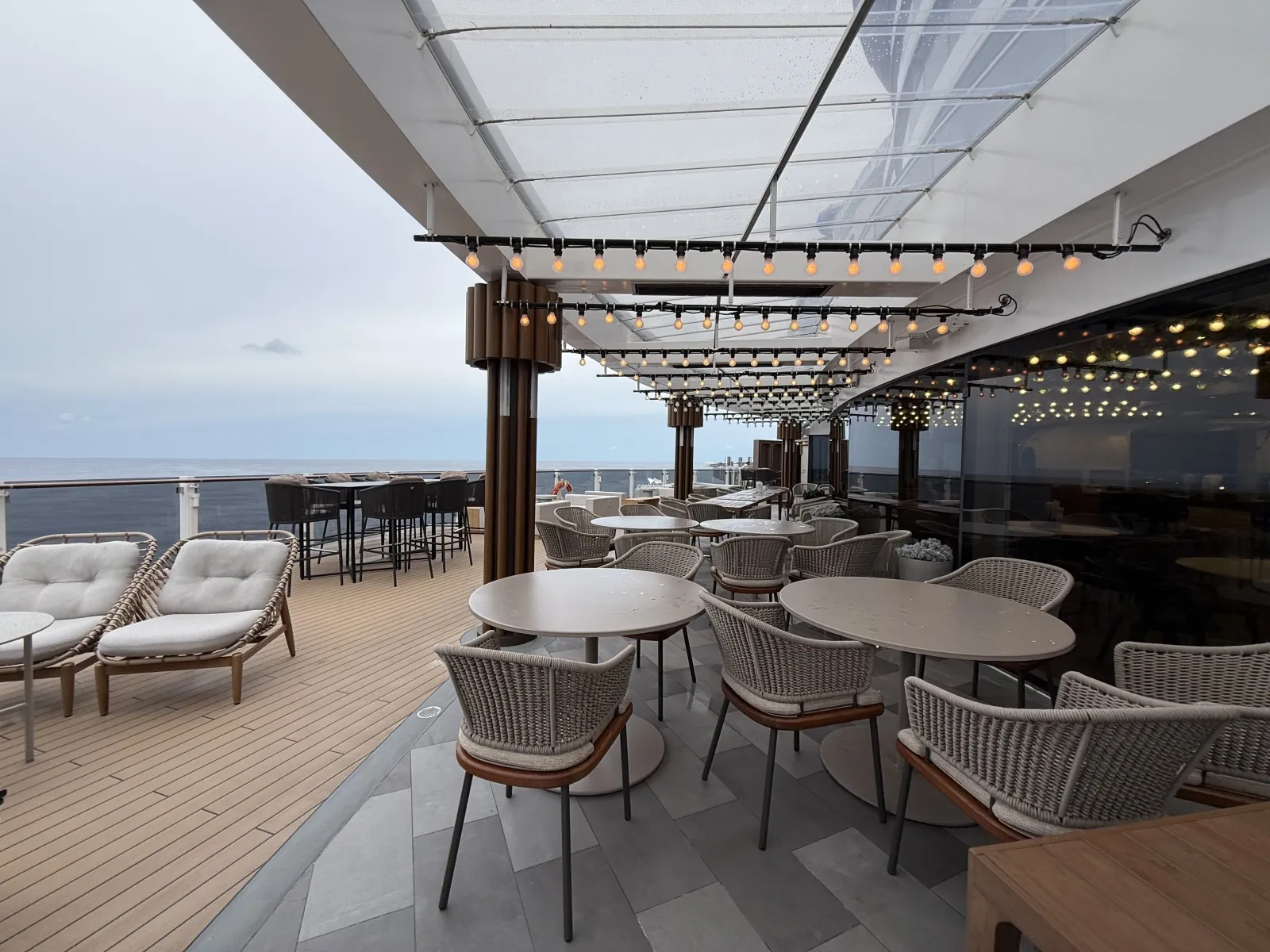 Indulge Food Hall outside area with various types of seating, cabanas and hammocks. Located here is the Sun Bar for cocktails. There is also a virtual firepit. Note: Soleil and Luna Bars only offer a limited selection of drinks.Oceanwalk