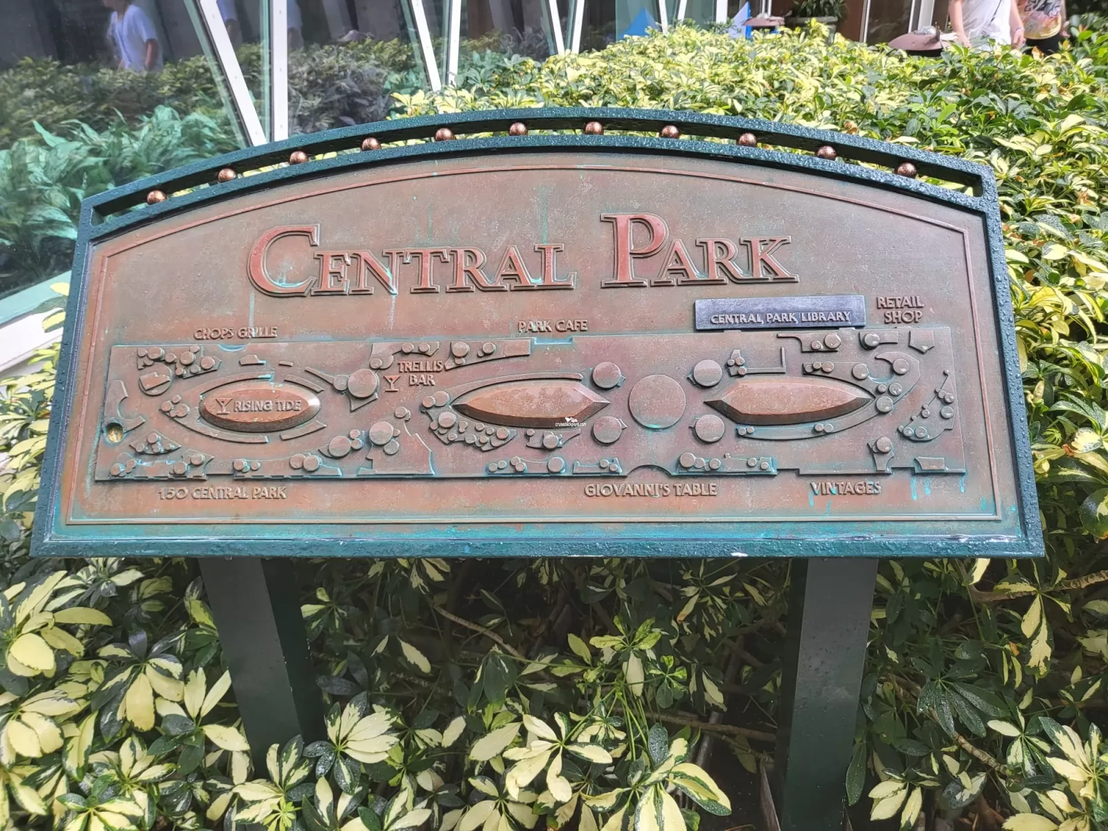 Provides an outdoor area where guests can relax in a space full of trees and plants. The superstructure is divided into two and features two Crystal Canopies where guests can view activities taking place on the Royal Promenade below. Towering up either side of Central Park are 'living walls' spanning five decks and featuring flowering vines of red and white Mandevilla 'Sun Parasol', Petrea volubilis 'Purple Wreath', Clerodendron 'Bleeding Heart', Alternanthera dentata 'Purple Knight' and Thunbergia 'Stormy Sky'.Giovannis Table