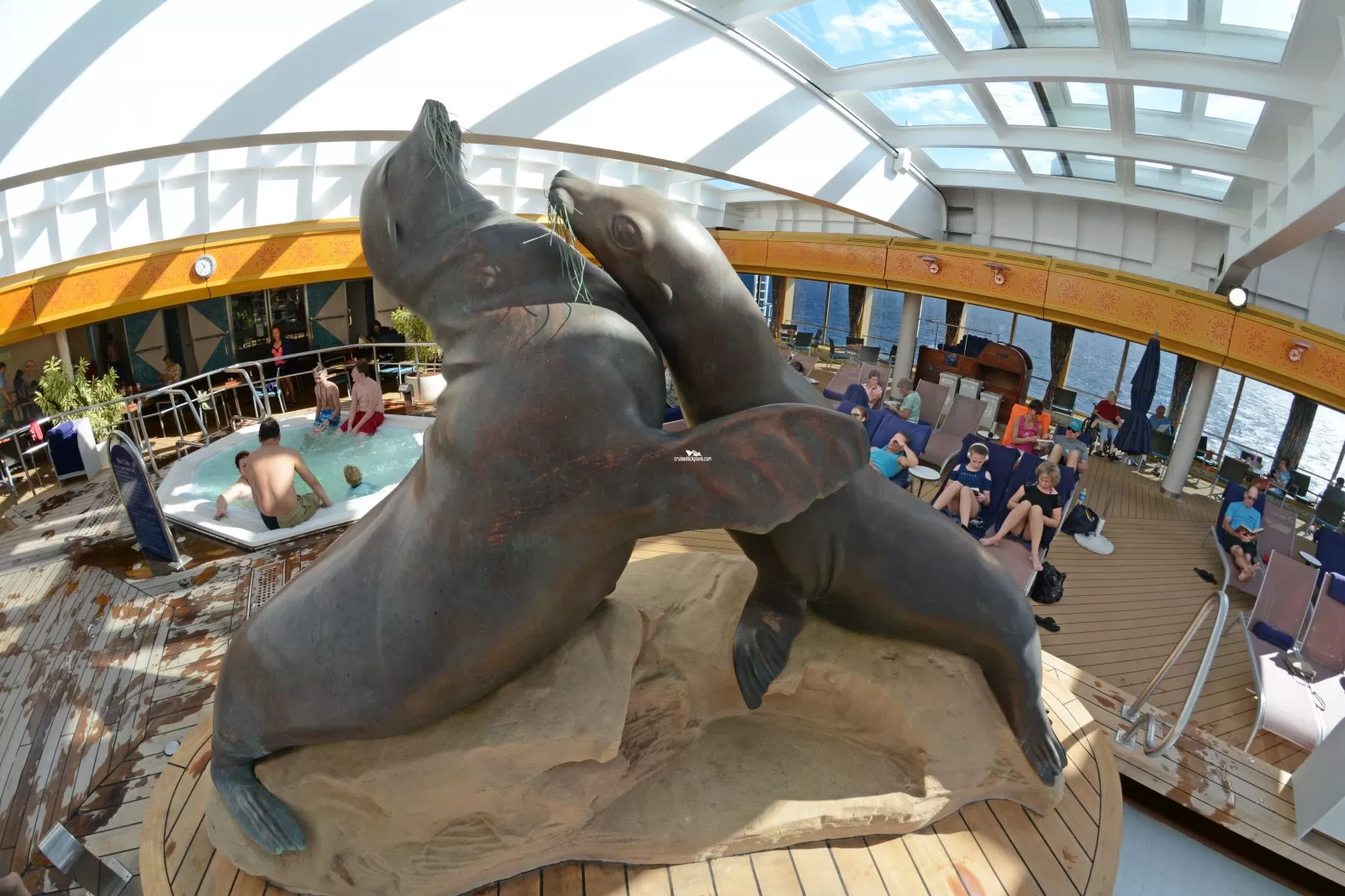 The ship's second pool which features a large overhead screen airing various movies and videos, pivoting lounge chairs situated in shallow water and a wading area with tiled benches and a hot tub.New York Pizza