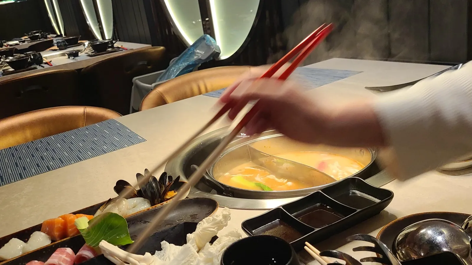 Located in the Umai Teppanyaki area, this venue serves a variety of vegetarian, seafood and meat. All food is self cooked and served in bowls that are kept heated at the table. Food selection includes beans, tofu, noodles, white shrimp, scallops, calamari, black mussels, whole clams, salmon, pork belly, chicken breast, beef striploin. You can create your own veggie-seafood-meat bowls by selecting 2 items from each of the 3 categories. Three kinds of soup base to choose: tomato, miso, lime and lemon grass. The pot has a divider to separate the soup. The waiter will help you if you don't know what to do.Non-smoking Casino