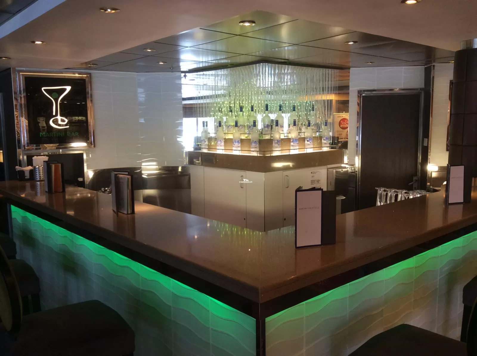 An intimate reservations only additional charge restaurant. 62 seats. Charges for eating here are $10 per head for lunch and $25 per head for dinner. Under 12's eat free whilst teens cost 50% of the adult charges. Dishes on offer range from premium sterling silver beef, filet mignon and jumbo prawns, and broiled lobster tail to Caesar salad and lobster bisque for starters and chocolate and raisin bread and butter pudding or baked Alaska for dessert.Explorations Cafe