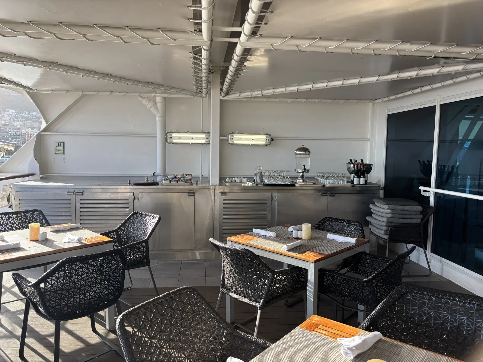 Area between Windows Cafe and the Pool that has tables and chairs for eating.Sanctum Terrace