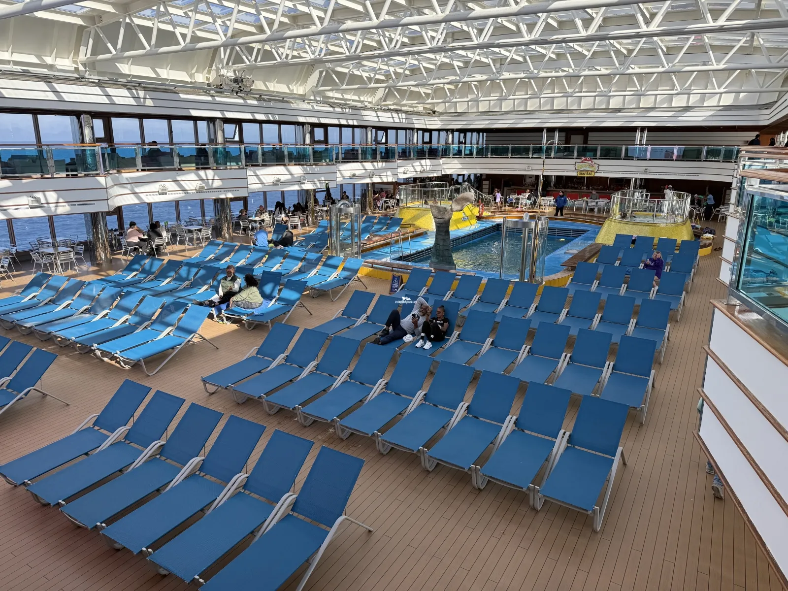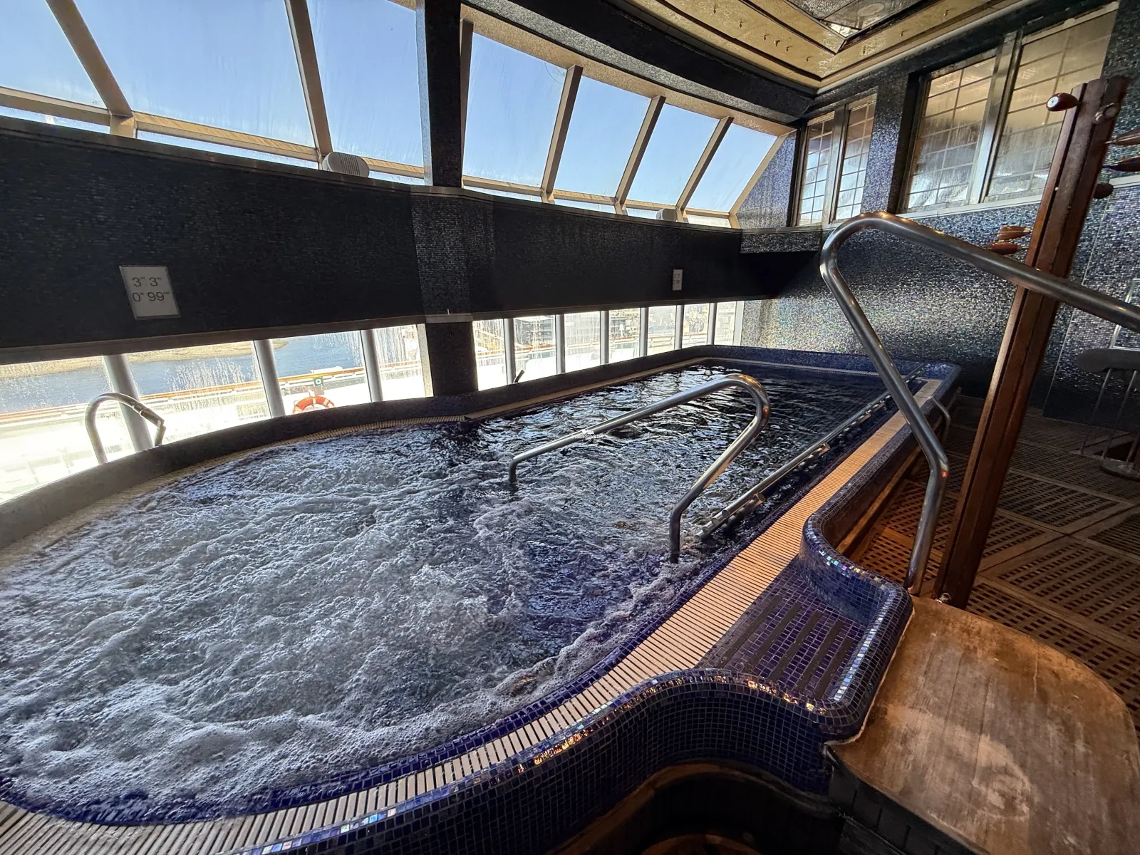 Hours: 8:00am-10:00pm / Hot Tub Spa: 8:00am-12:00am, weather conditions permitting / hours are subject to change. Adult-Only, outdoor private relaxation area on both the starboard and portside with shaded sun loungers and luxurious chaise lounges. Guests must be 21 years or older. Salt water pool (4'6" deep). 2 Hot Tub Spas. Piped in Music. Bar for beverage service ($).Tacos