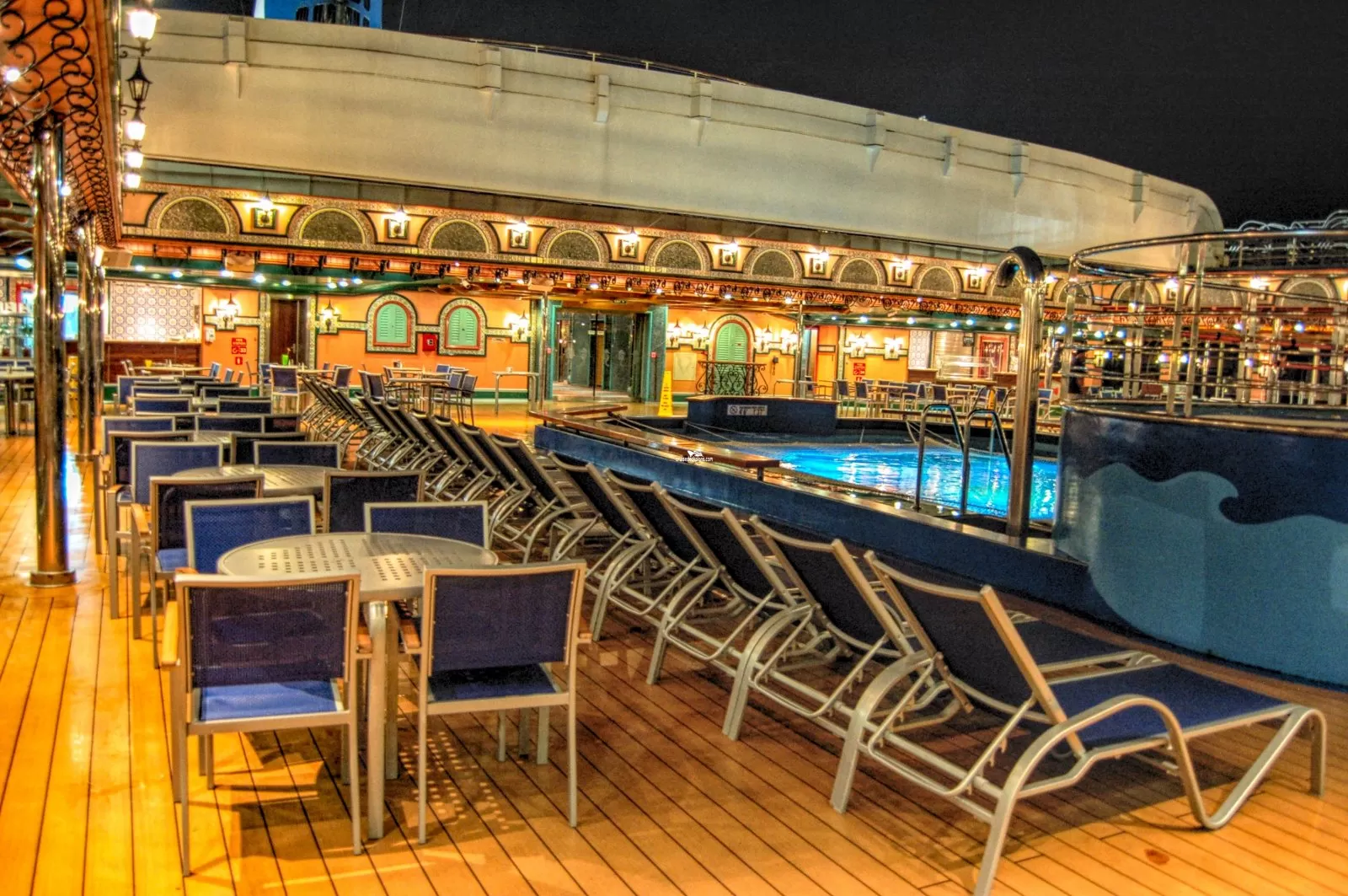 Aft pool on the lido deck covered by retractable glass roof, with bar, two hot tubs, pizza and grill. Saltwater pool: 21' x 16' / depth 4'6 inches. Open 8:00 a.m. to 1:00 a.m. Whirlpools close at 11:00 p.m.Tritons Pool