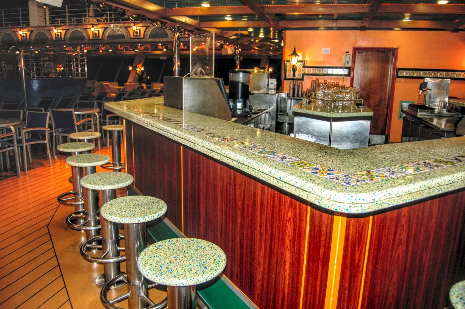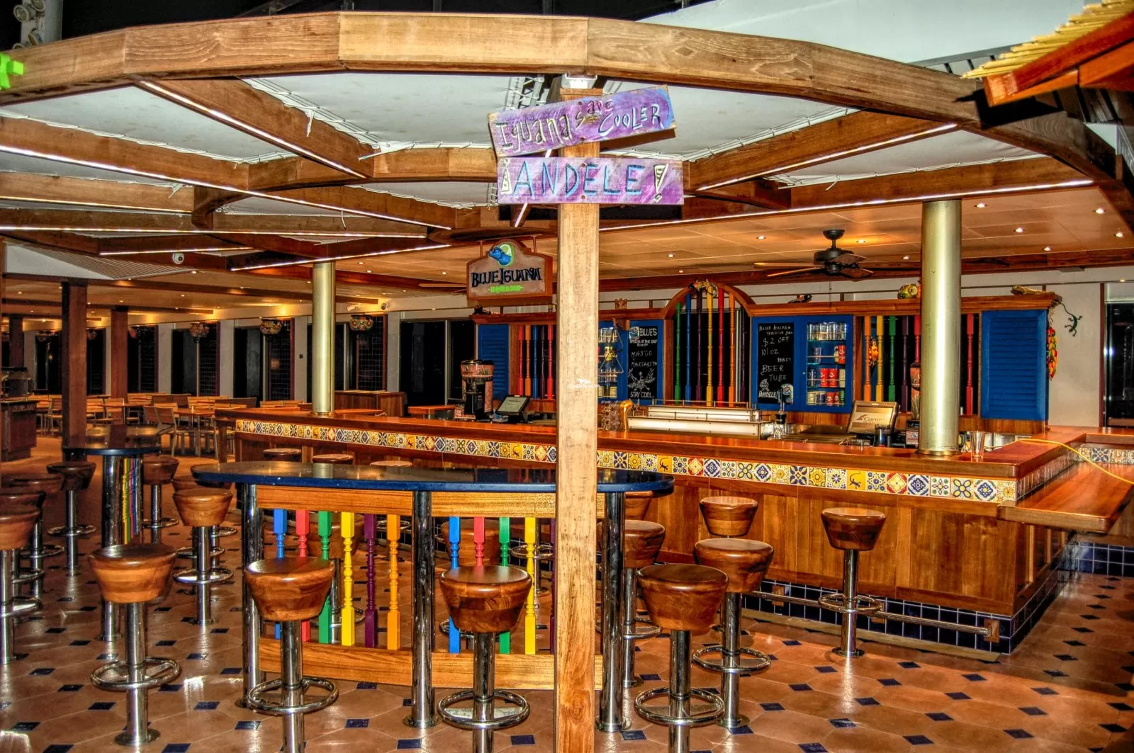 Serves a selection of Caribbean rums along with ThirstyFrog Red, the ships private label draft beer.Blue Iguana Cantina