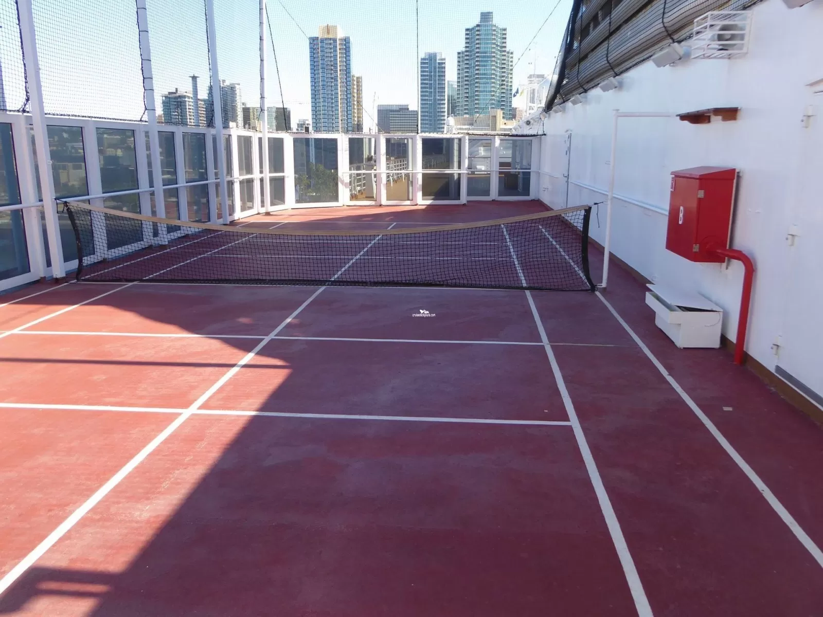 Deck above Lido Pool area with places for lounging and strolling.Sports Court