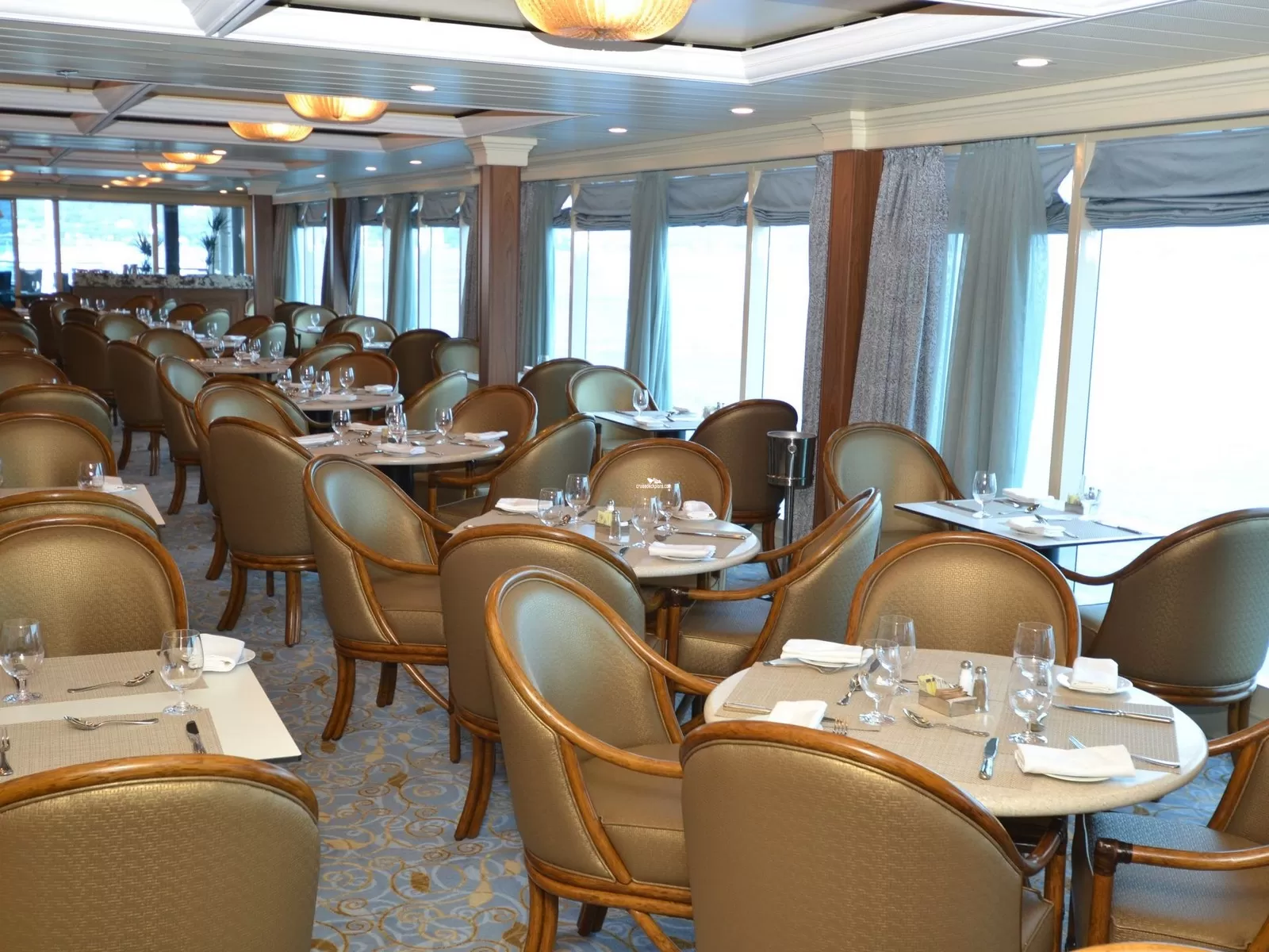 Serves ever changing breakfast and lunch buffets where you can dine indoor or outdoor as the Cafe opens onto both the teak-lined Pool Deck or aft onto the Terrace.Waves Grill