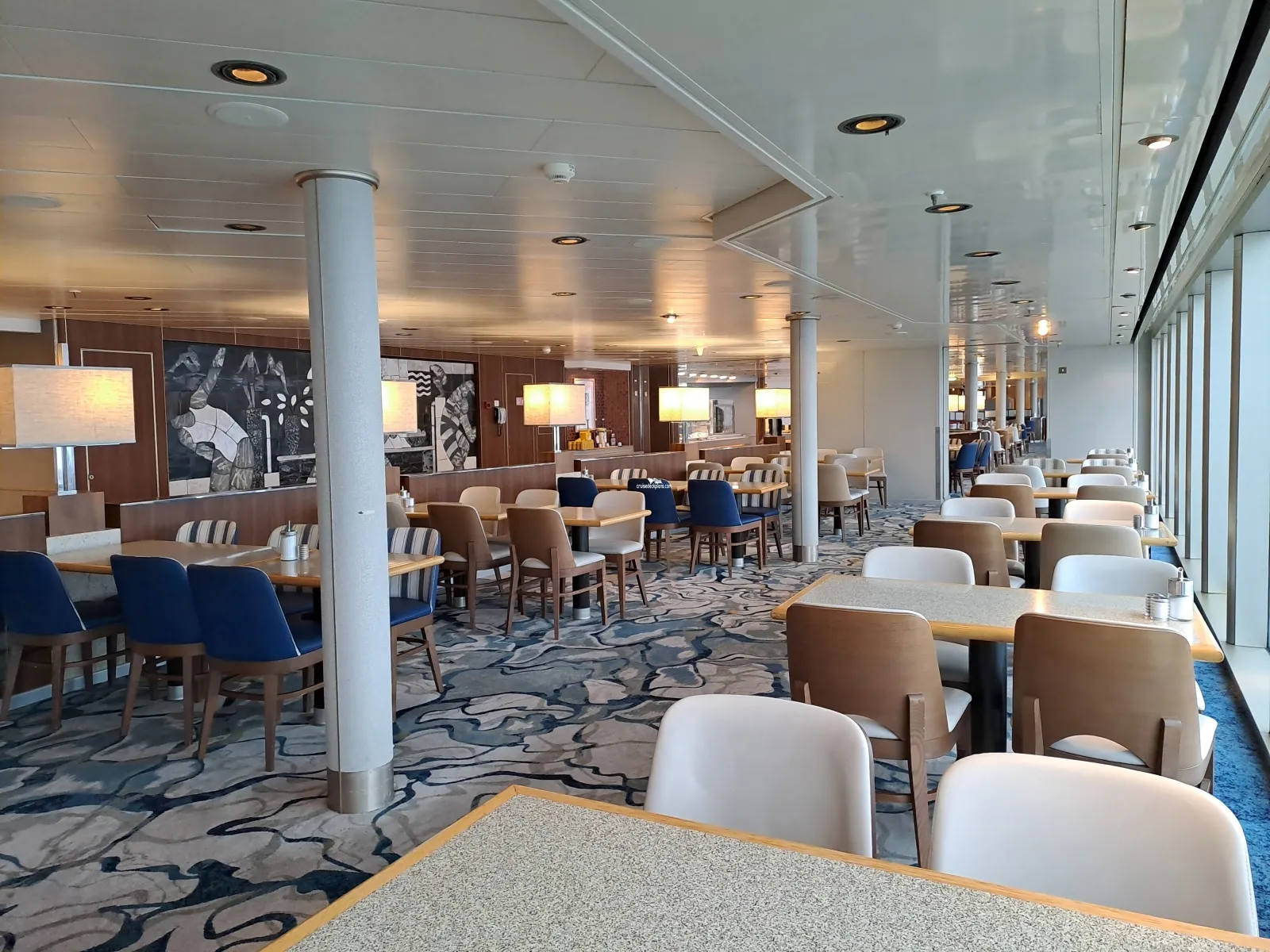 Self-service buffet restaurant with floor-to-ceiling windows that provide natural light and panoramic views.Neptune Grill