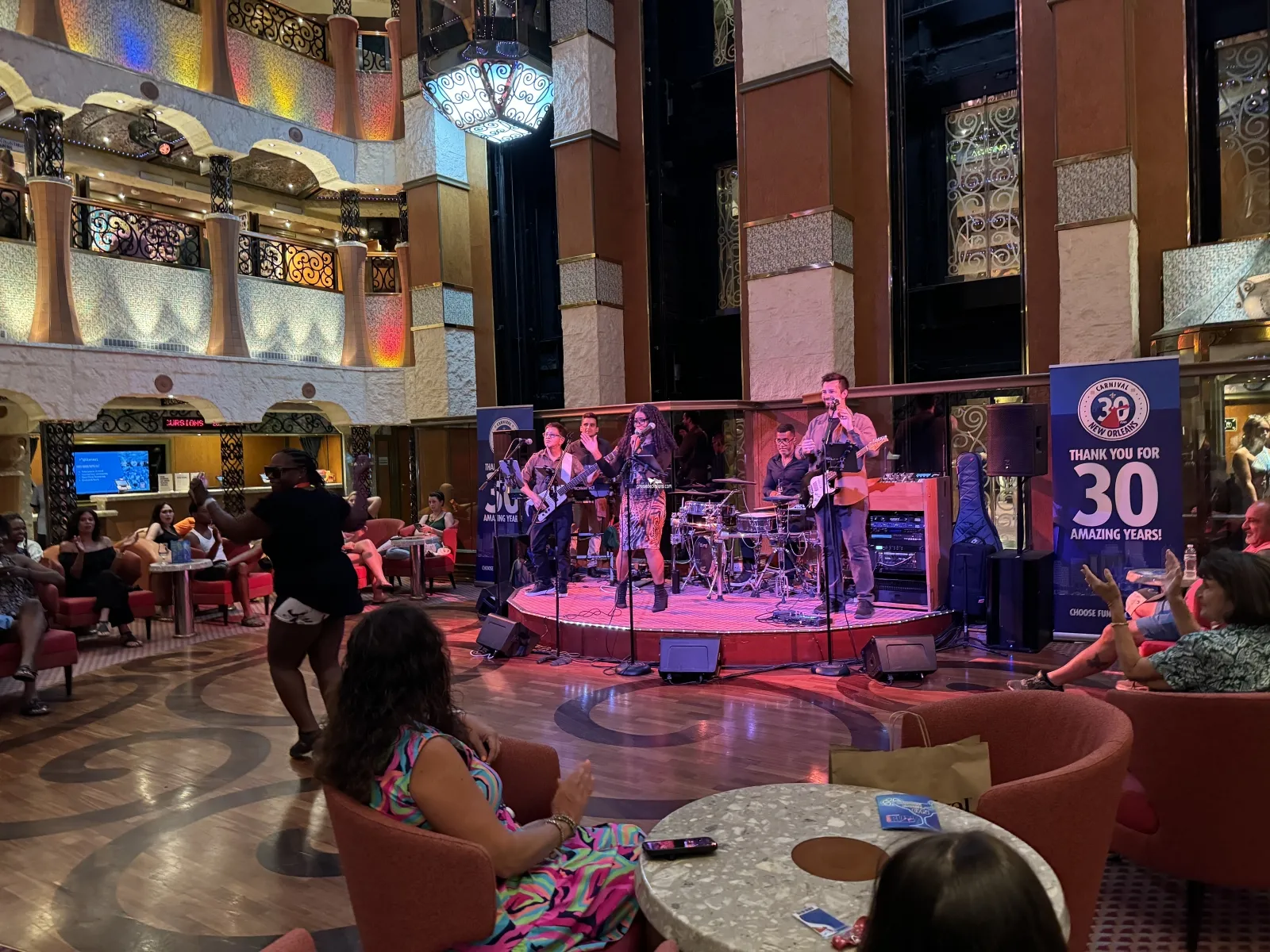 Ships atrium with guest services desk, shore excursion desk, large bar and seating.Exterior Deck