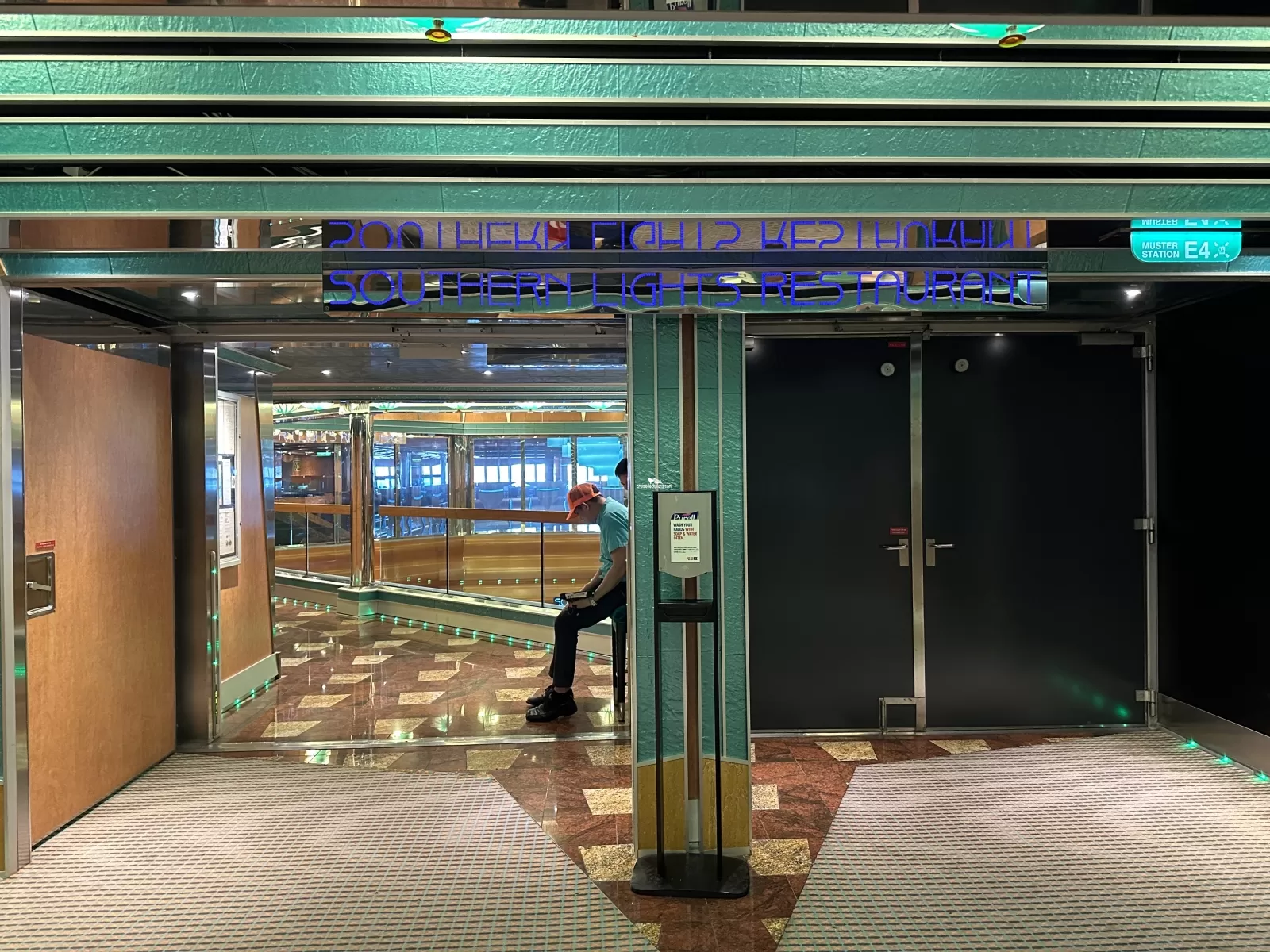 Dining room located in aft of ship that seats 1248 people. Two levels. Open nightly for dinner starting at 6:00 p.m.Northern Lights Dining Room