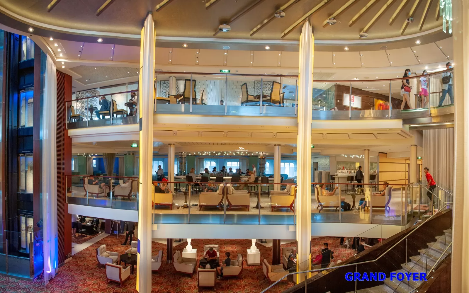 Three story high atrium. On first level is guest services, shore excursion desk, a bar and lounge area.Shore Excursions