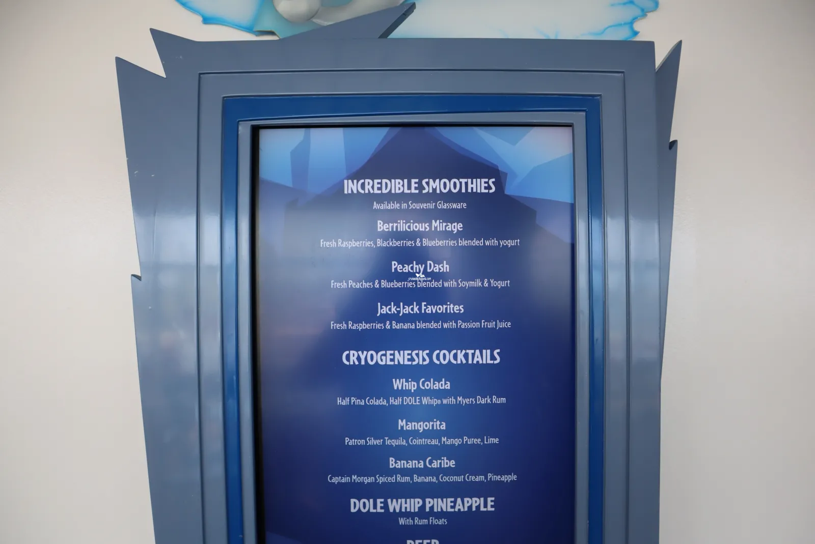 Located port side of ship on deck 11. A smoothie bar, themed after the character Frozone from the Disney animated film, The Incredibles. Please note that food and beverages are not allowed in the pools or whirlpool spas.Cabin Check Tool