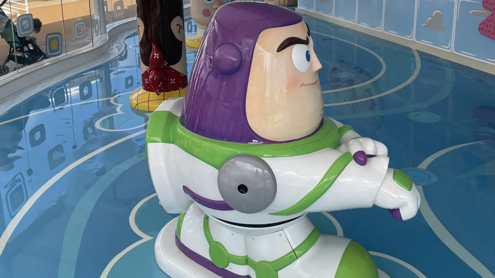 Water play area for families with young children. Features Toy Story characters as rubber bath toys.Wheezies Freezies