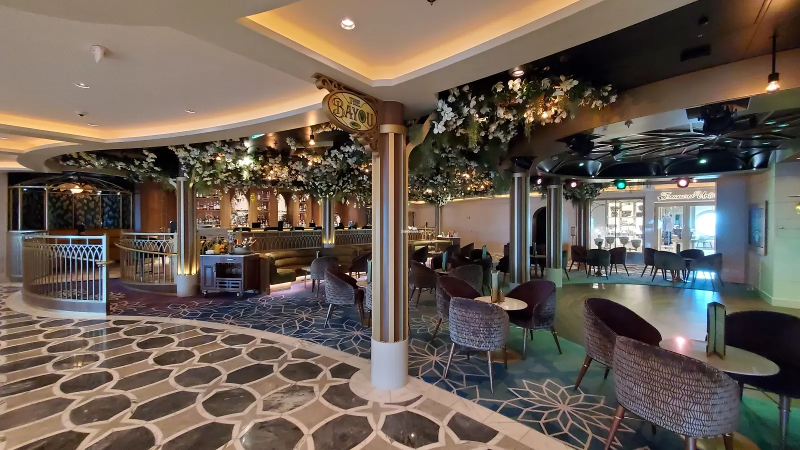Lounge themed to Disneys Princess and the Frog. This space transforms in the evening into an adults-only lounge, while during the day hosts a variety of activities. This venue has its own bar serving specialty coffees.Nightingales