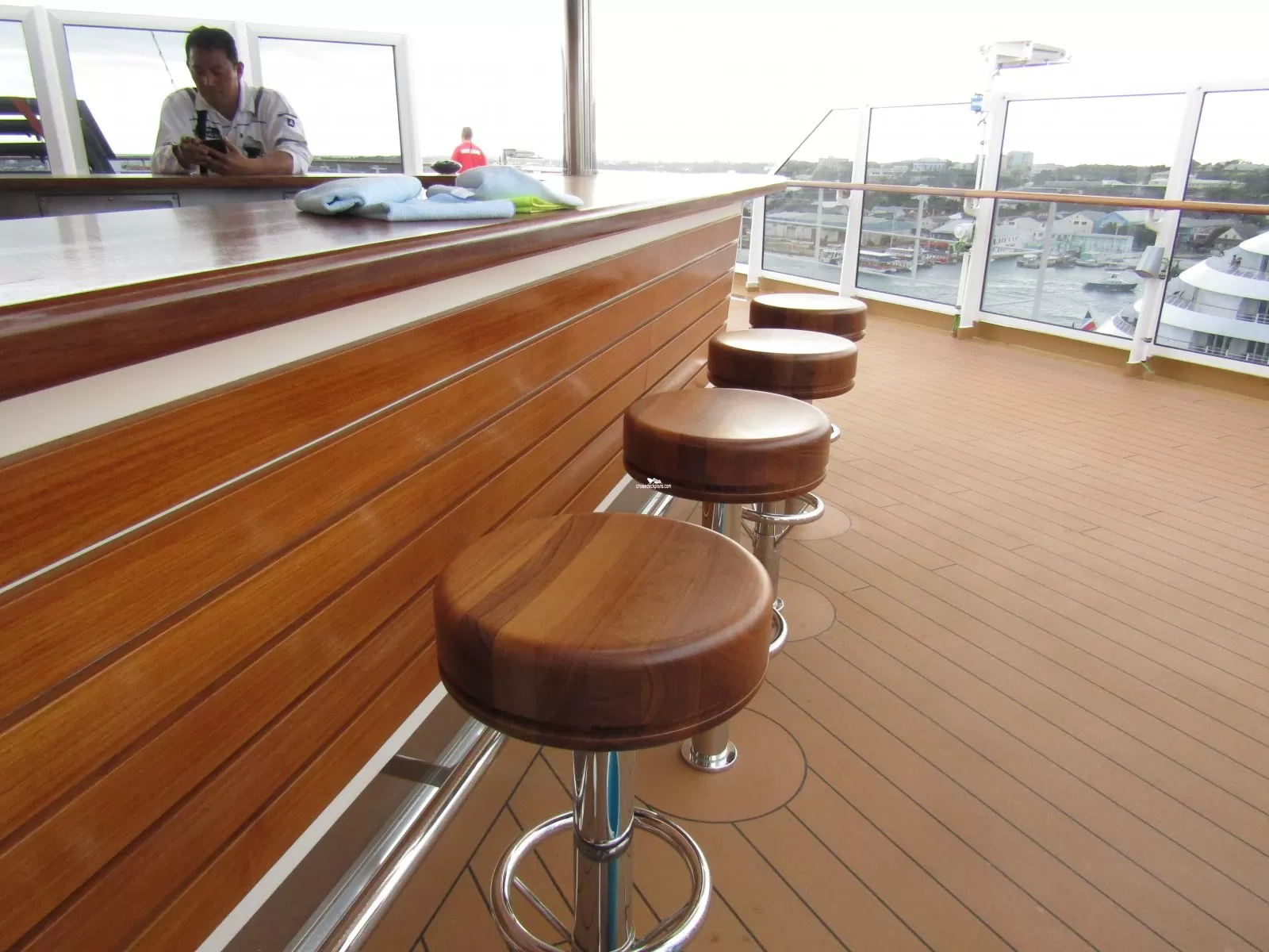 Bar serving aft Sun Deck area. Finest woods construction and wildly functional design. Has beautiful aft viewing with plenty of seating. Can be leased out for private parties. Aft elevator convenient right to deck 11Cabin Check Tool