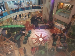 Ships atrium. On the first level is a lobby bar, guest relations and shore excursions deskCabin Check Tool