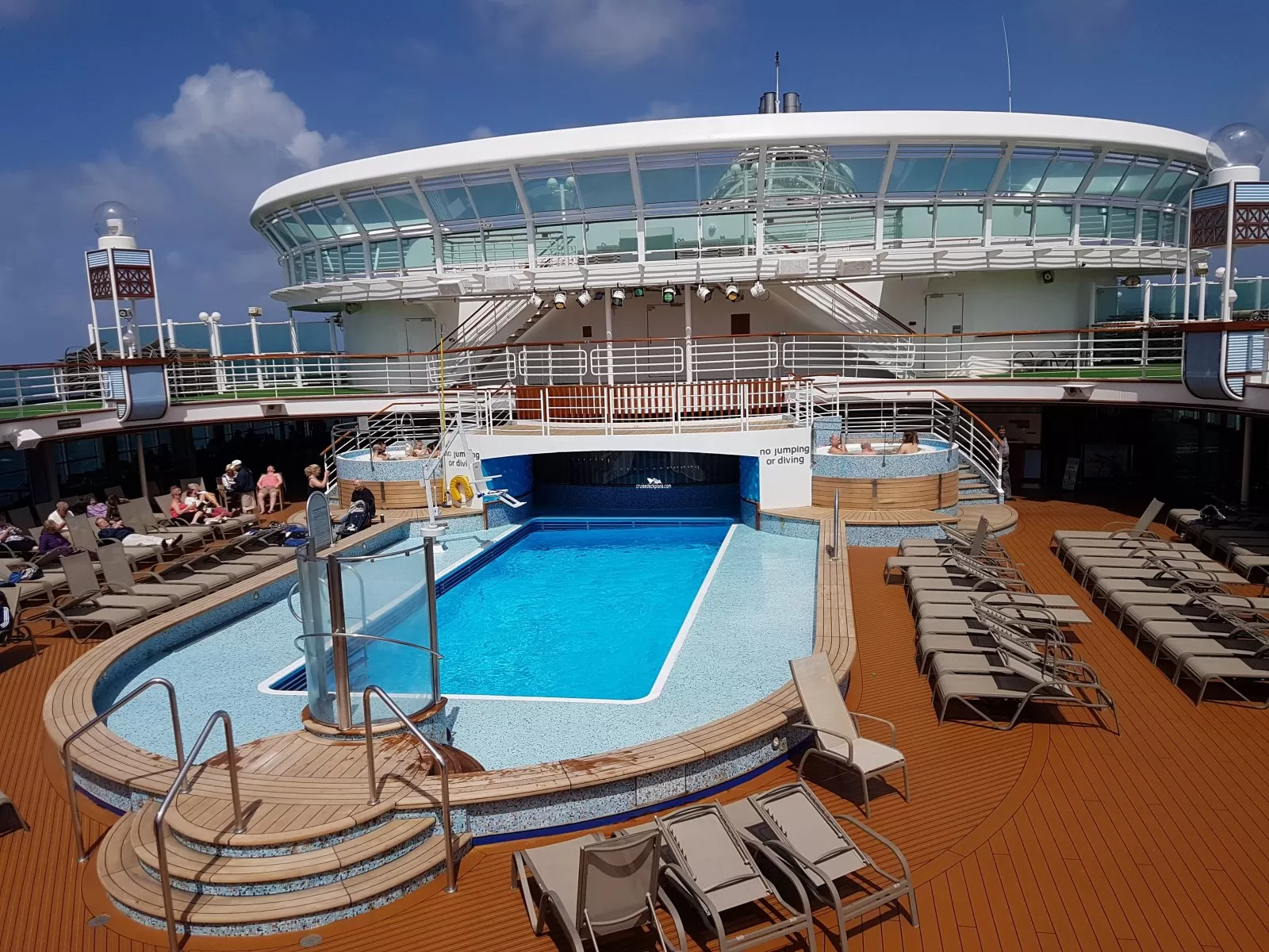 Open air main swimming pool located midship on Deck 15 with two whirlpool spas.Waterside