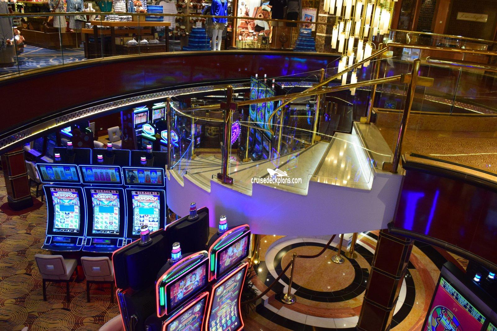 Two level atrium leading from the casino on Fiesta Deck to the shopping area on Promenade deck.