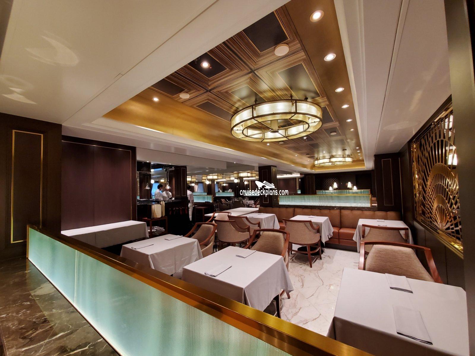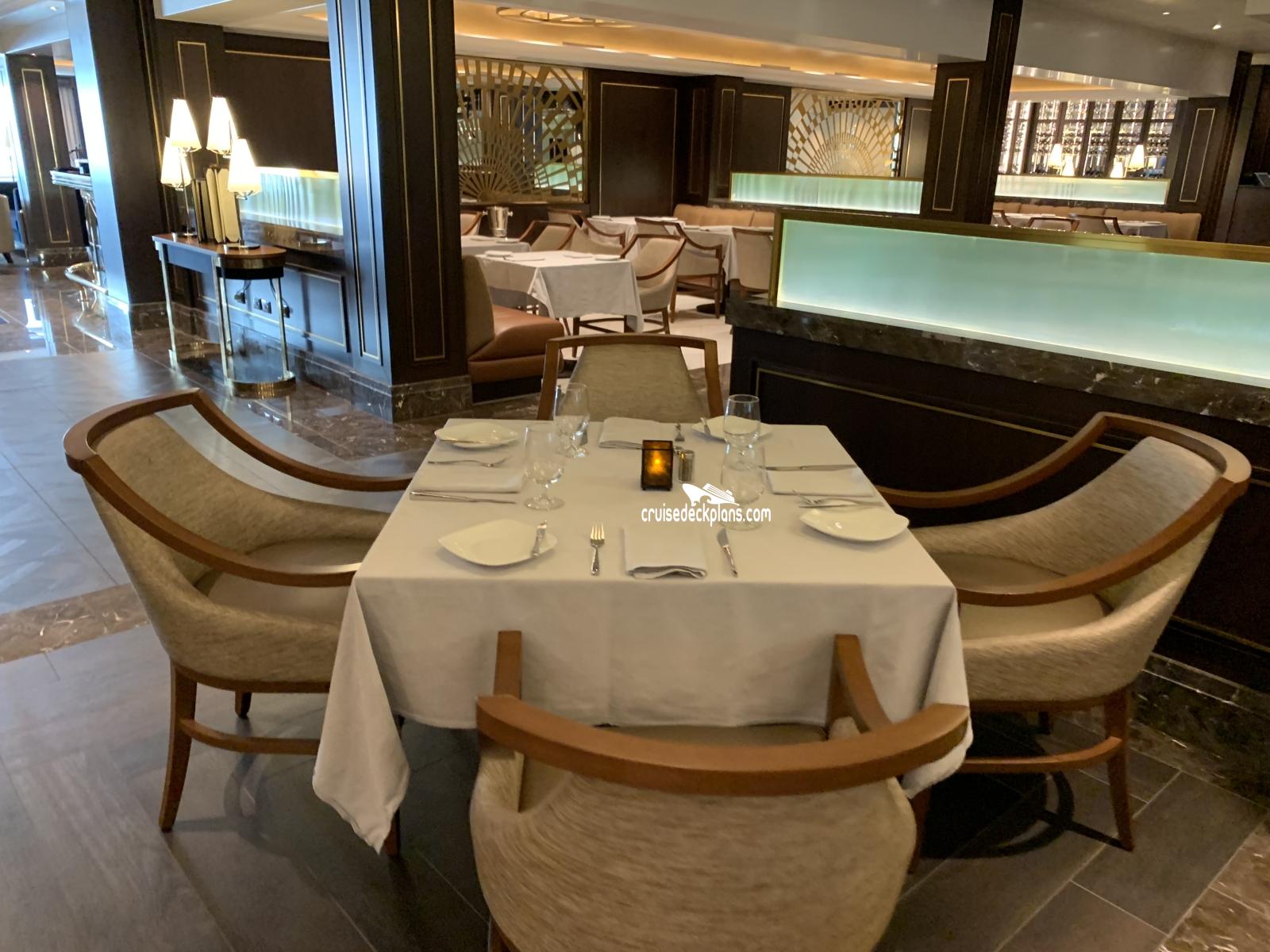 One of Royal Princess' two additional charge specialty restaurants and specializes in premium steak and seafood including lobster, scallops, clams and cooked-to-order steaks. Some items may be subject to additional charge and reservations are recommended. The room has a club like atmosphere to it and includes live piano entertainment.