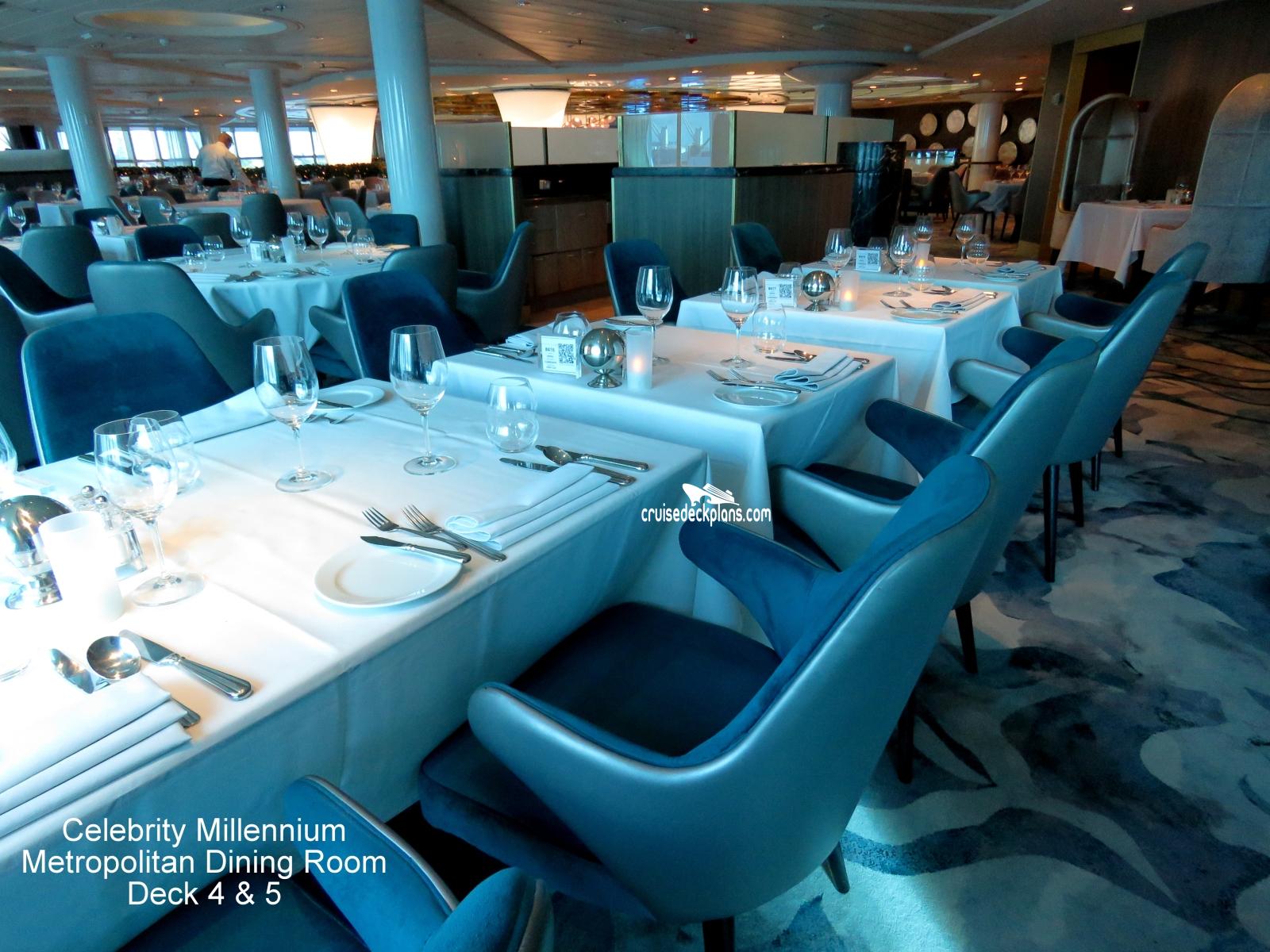 This page shows actual pictures for Celebrity Millennium Metropolitan Restaurant. Most of our pictures are contributed by actual cruisers. You will find that all the Celebrity Millennium Metropolitan Restaurant pictures on this page also posted directly onto our deck plans near the actual location the photo was taken. You can browse the pictures here or you can click on them as you are viewing the Celebrity Millennium deck plans. For deck plan viewing click on the ship button above or scroll down to view the pictures on this page.